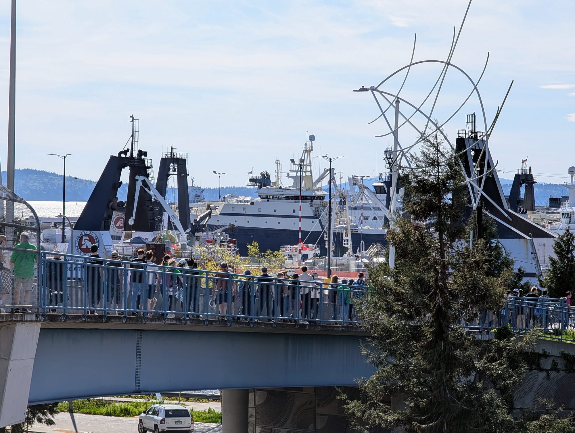 Marches received plenty of supportive honks from motorists along the route, as they crossed the Ballard Bridge and headed to Expedia Park. (Doug Trumm)
