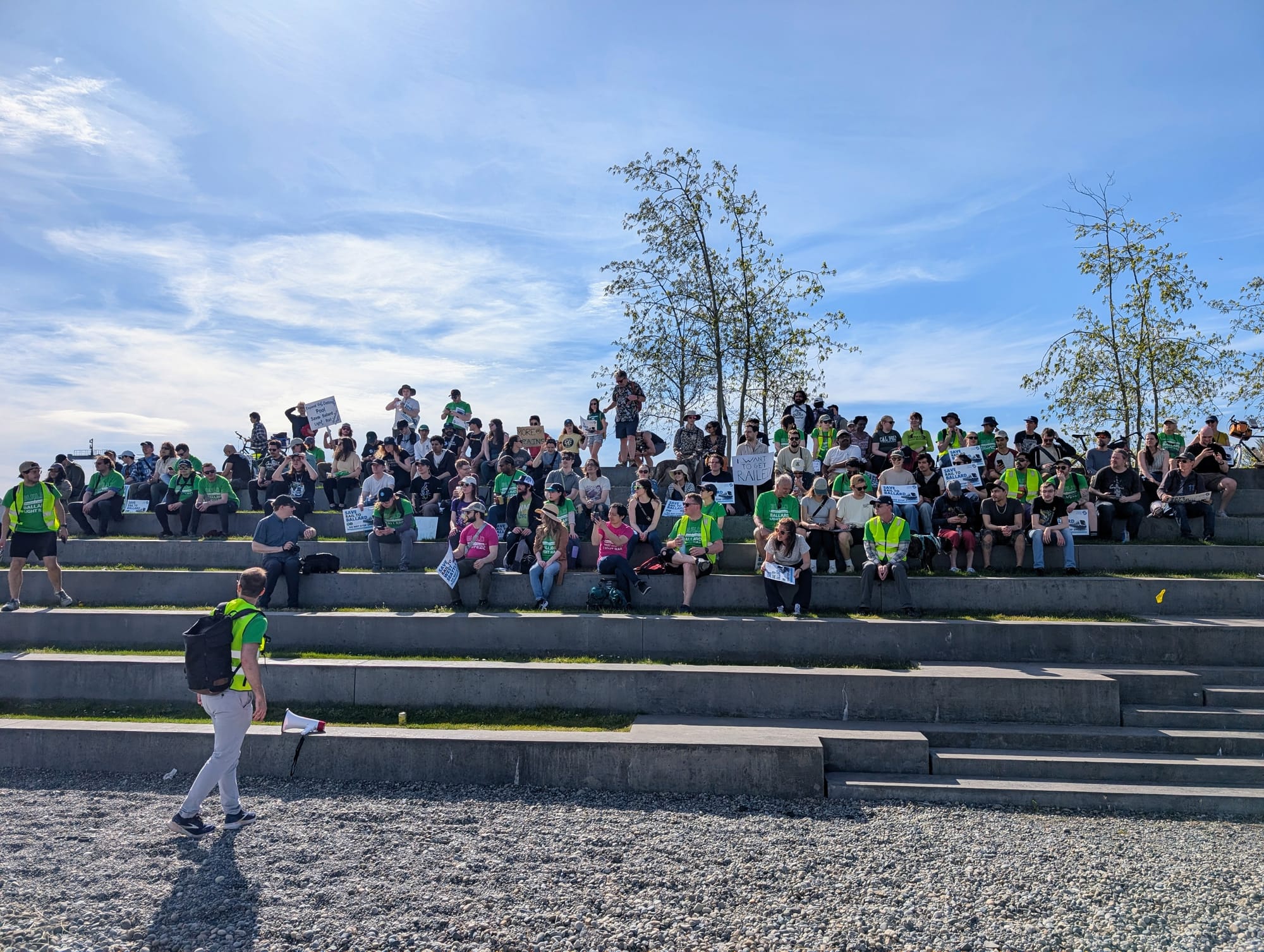 Ballard march organizer Carl Aslund gave one last speech as a group of still well over a hundred attendees arrived at the end of the march at the beach at Expedia, near the planned Smith Cove light rail station that might end up being the terminus of the line if Ballard is truncated. The other choice is Seattle Center, which would bring significant impacts to one of the city's biggest cultural hubs.