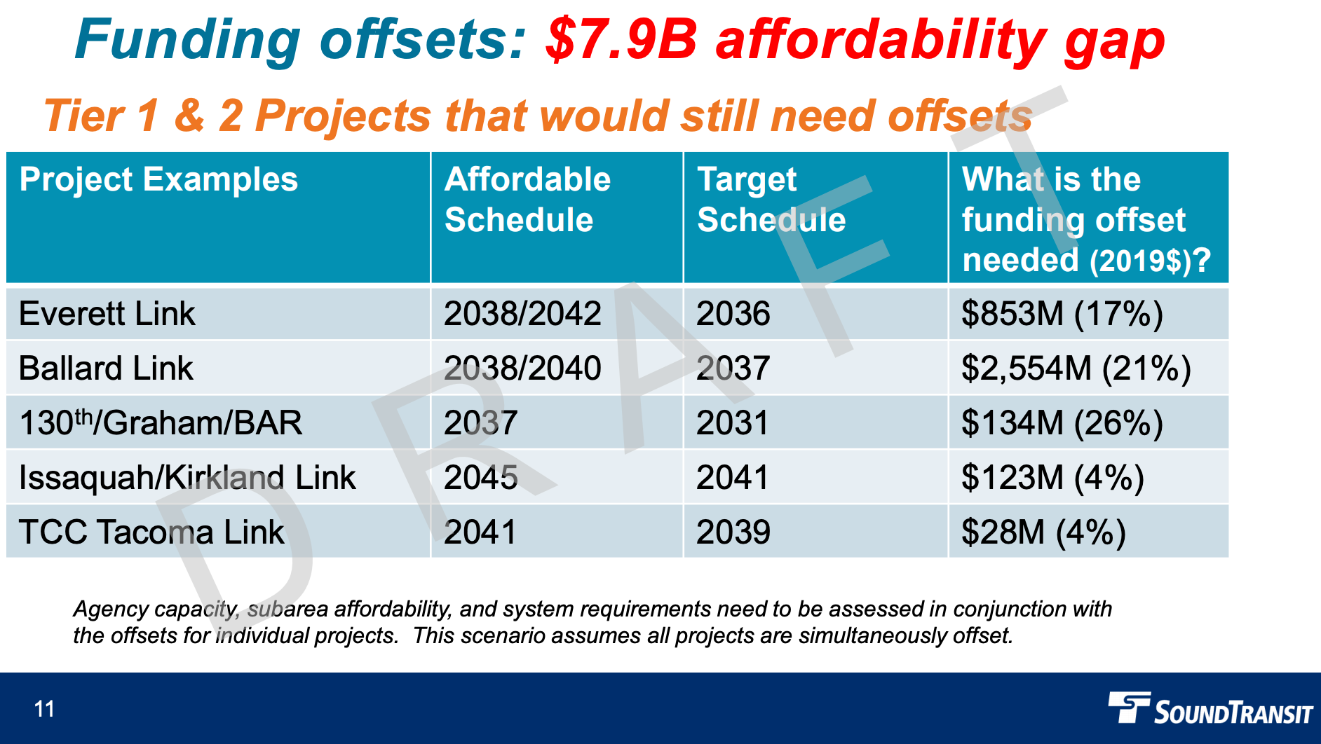 Conversely, the target schedule comes with two different scenarios. The base target schedule scenario assumes all projects will close the affordability gap and only “planning delays” like environmental review, permitting, and right-of-way acquisition would affect delivery dates. That means projects could have one to two years of delay over the voter-approved timelines, and in rare cases longer delays.As a practical matter though, Tier 1 and Tier 2 projects would remain a priority over Tier 3 and Tier 4 projects, so the target schedule path comes with an additional scenario to act a bit like a backstop. The alternative scenario assumes affordable schedule delivery dates for Tier 3 and Tier 4 projects while Tier 1 and Tier 2 projects are assumed to close their affordability gaps with near or on-time delivery, except for planning delays. However, the goal would be to fully fund Tier 1 and Tier 2 projects and work to eliminate any delays to Tier 3 and Tier 4 projects by closing affordability gaps.As for offsets, the agency has highlighted Tier 1 and Tier 2 projects where additional funding and project savings would be necessary to make the target schedule delivery dates. Two versions of the funding offsets were provided assuming the affordability gap at $7.9 billion and $6.5 billion. Looking at only the $6.5 billion affordability gap level, the following projects could meet their target schedule delivery dates if offsets are attained:Everett Link would need $602 million or 12% of its budget in offsets;Ballard Link would need $1.824 billion or 15% of its budget in offsets;Seattle infill stations would need $98 million or 19% of their budgets in offsets;South Kirkland-Issaquah Link would $93 million or 3% of its budget in offsets; andTacoma Community College-Tacoma Link would $21 million or 3% of its budget in offsets.Boardmember amendments proposed