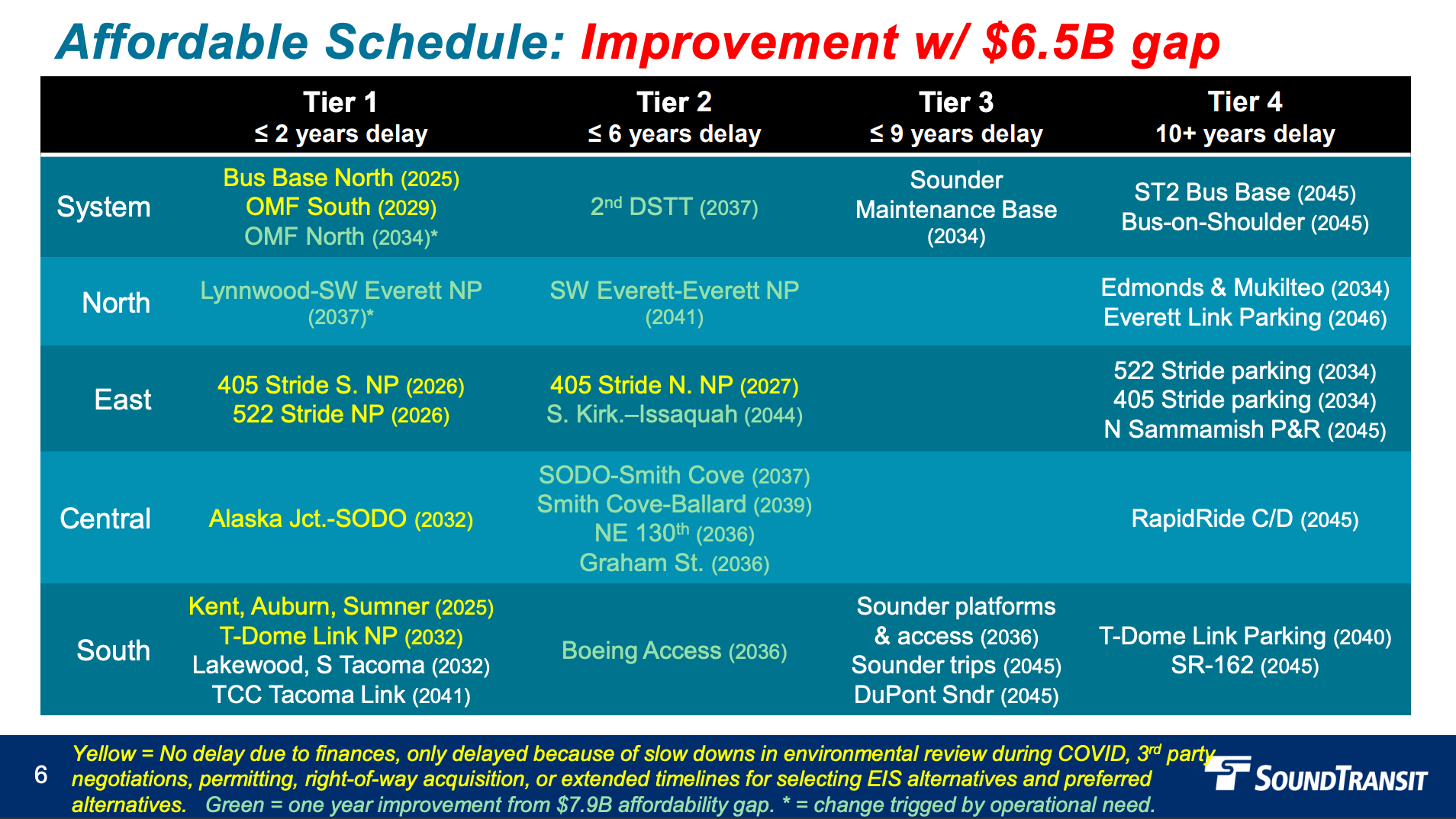 Looking at the two affordable schedule scenarios, the biggest difference is that Tier 2 light rail projects could be delivered about one year earlier under the $6.5 billion affordability gap scenario. Along with this, the Operations and Maintenance Facility (OMF) North and Lynnwood-Southwest Everett (with no parking) light rail projects would be delivered about one year earlier to facilitate the Seattle light rail expansions. The difference for light rail projects winds up being: