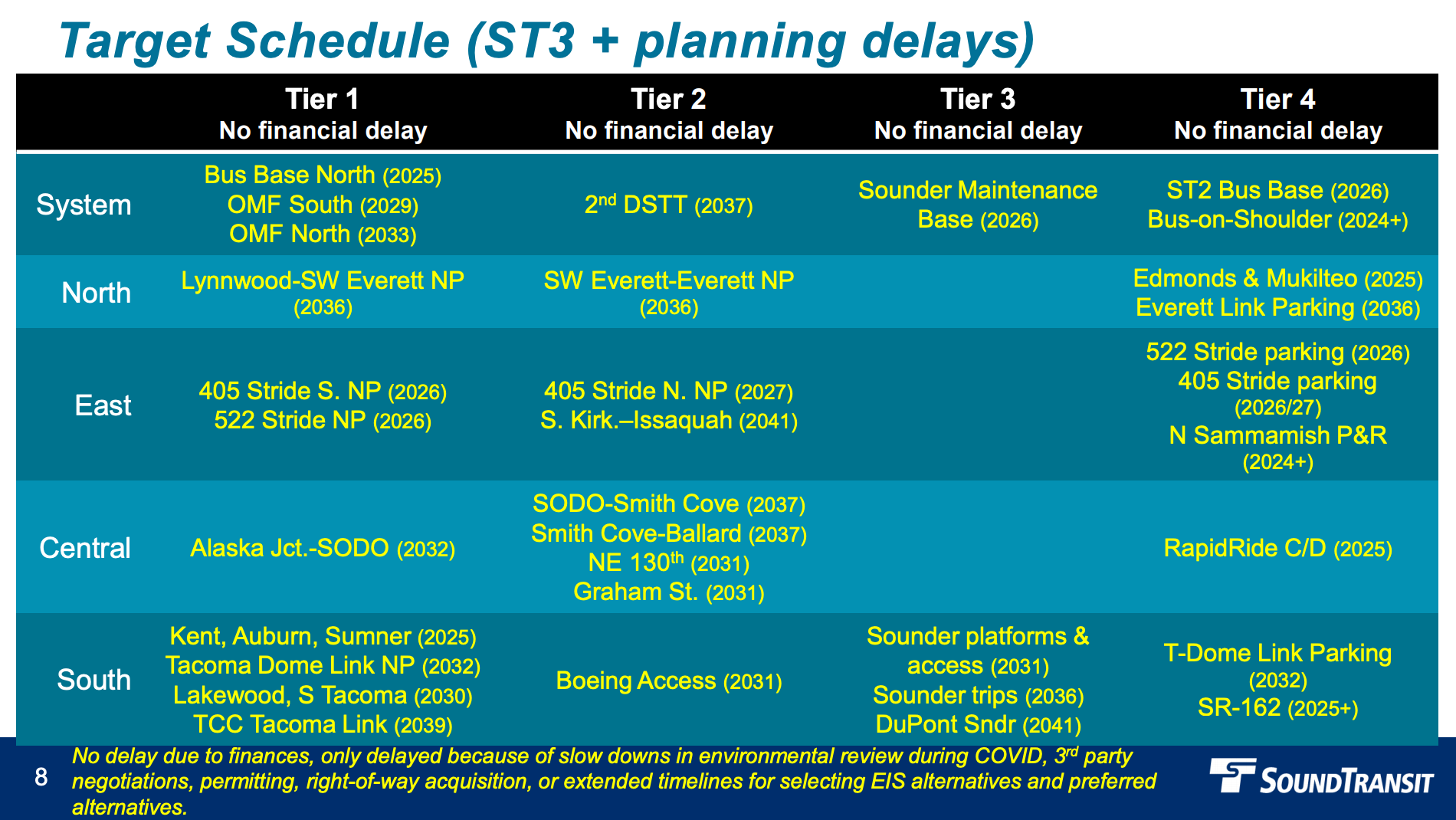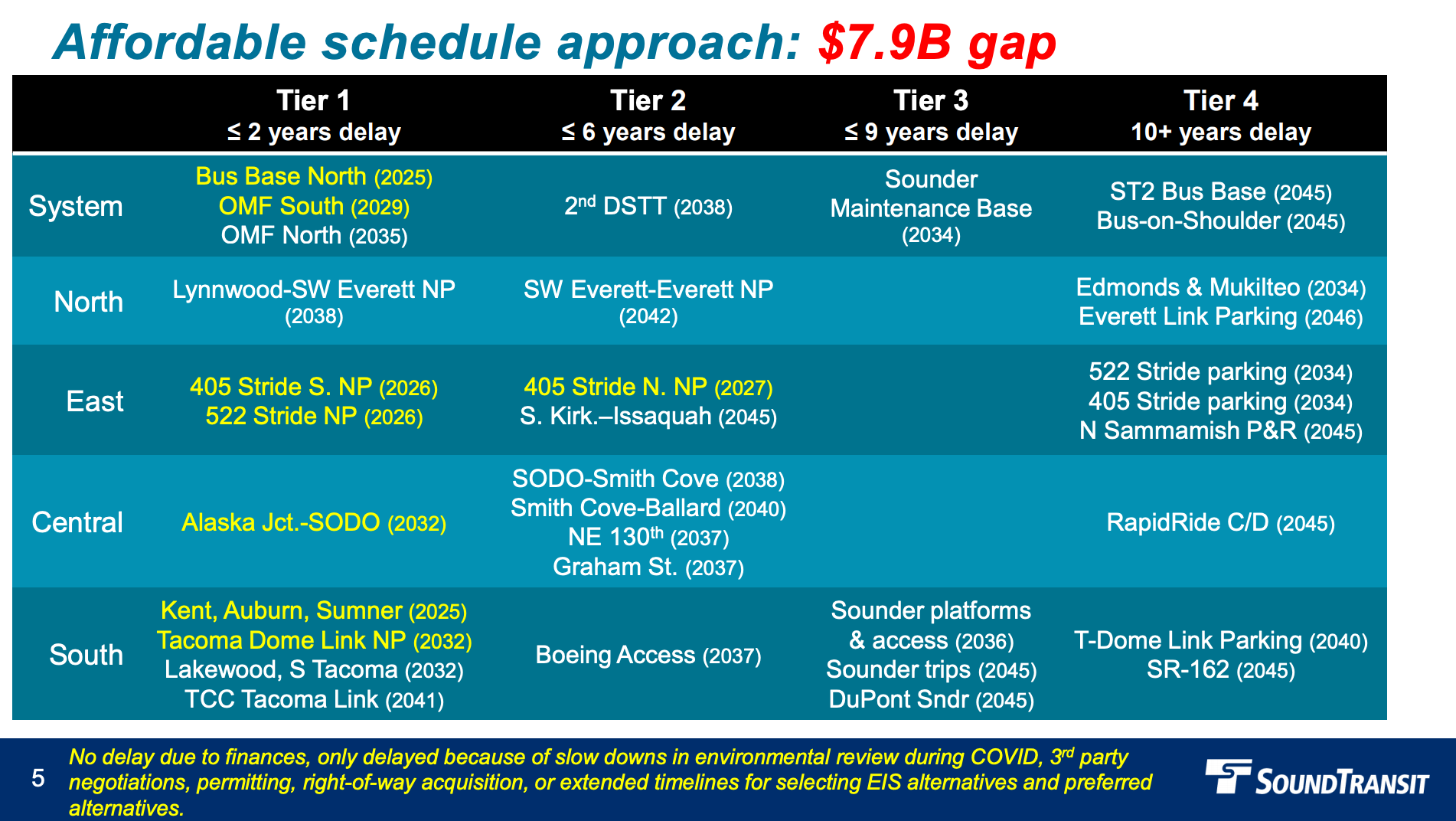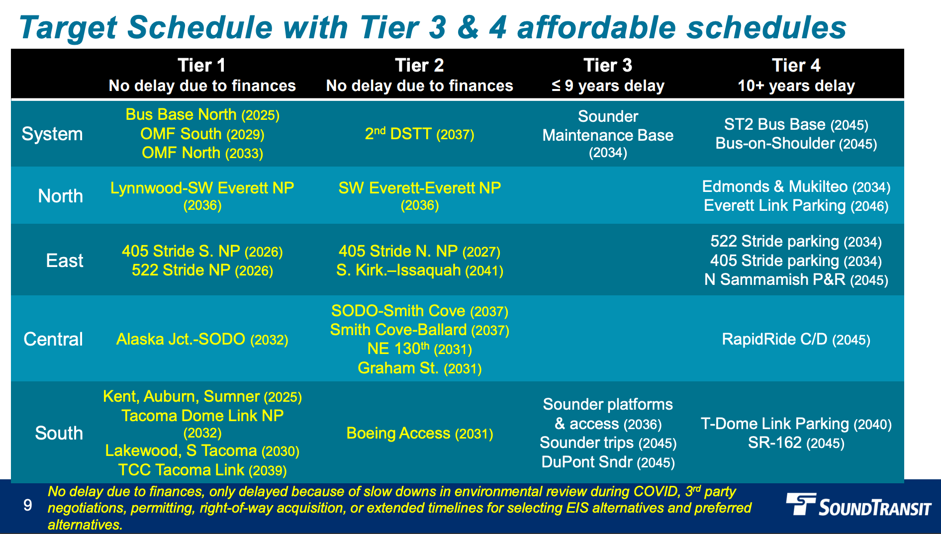 - The second Downtown Seattle transit tunnel, SODO-Smith Cove, and Lynnwood-Southwest Everett (no parking) in 2037 instead of 2038;