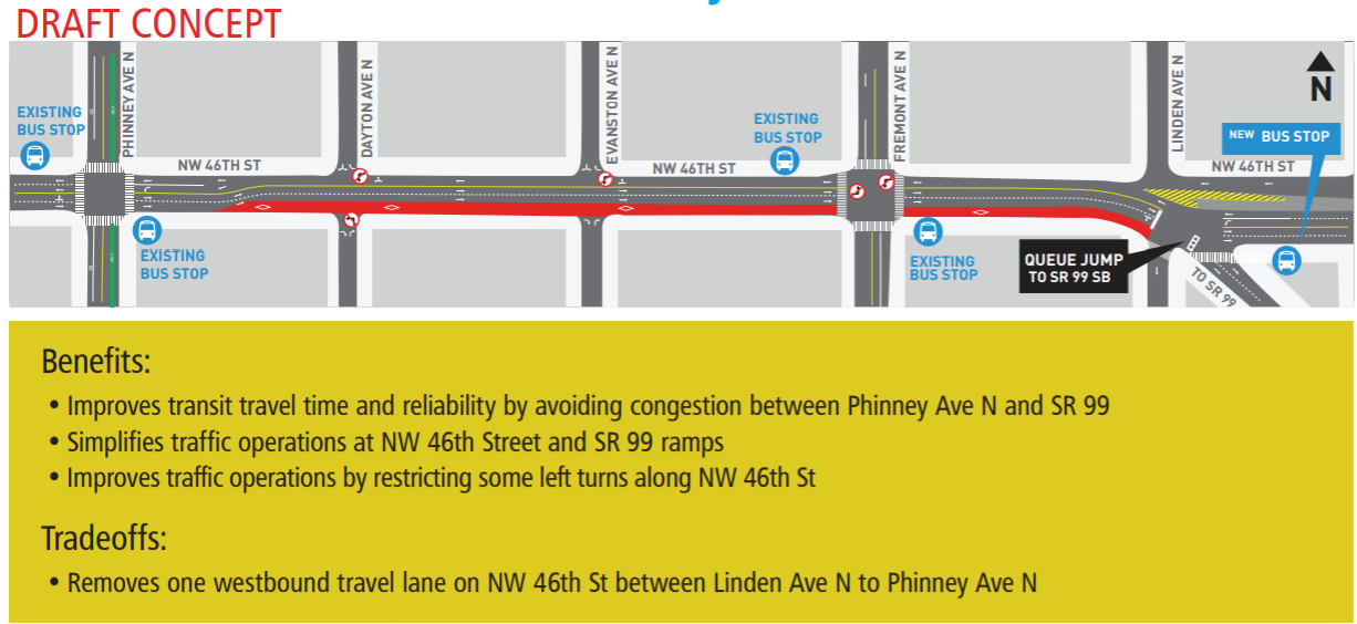 SDOT took up part of this concept, suggesting an eastbound bus lane in Ballard from 20th Avenue NW to 15th Avenue NW. This would help buses get through this busy, often-clogged intersection, but westbound buses could use the help too.