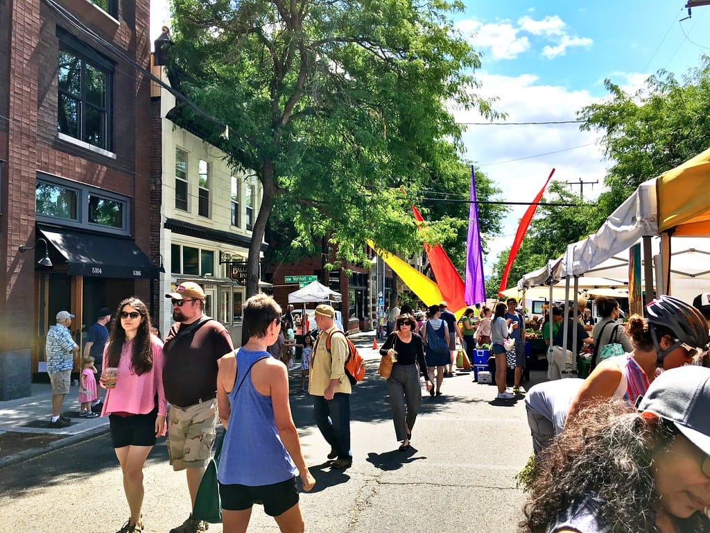 Eugene, Oregon has similar weekend markets, with a more hippy ambience, and in Seattle, the Ballard Farmer’s Market transforms Ballard Avenue NW into a pedestrian street on Sundays throughout the entire year.