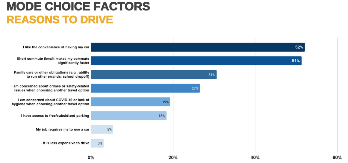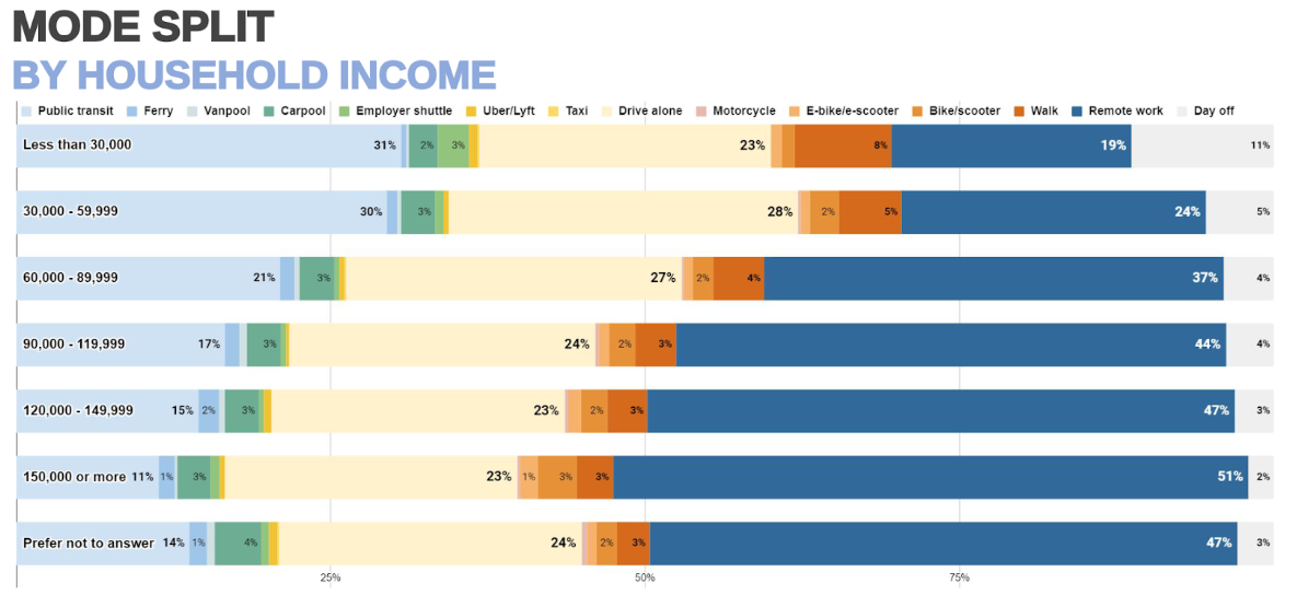 Cross referencing mode choice factors with data on home to work distance by mode reveals a picture containing a gap which longer more reliable rail services could fill: distances exceeding 10 miles. This gap has been closed before. Commute Seattle’s 2019 report measured an 18.1 mile distance for rail commuting, and the 2021 report shows rail distance falling behind driving for the first time. The statistical decrease in rail journey distance is likely attributable to Link’s ridership increases and Sounder’s plummeting numbers, further compounding the point that frequency and flexibility will be key in expanding rail’s ridership post-pandemic. Americans in Washington use rail if the schedules permit flexibility beyond 9-5 commuting.