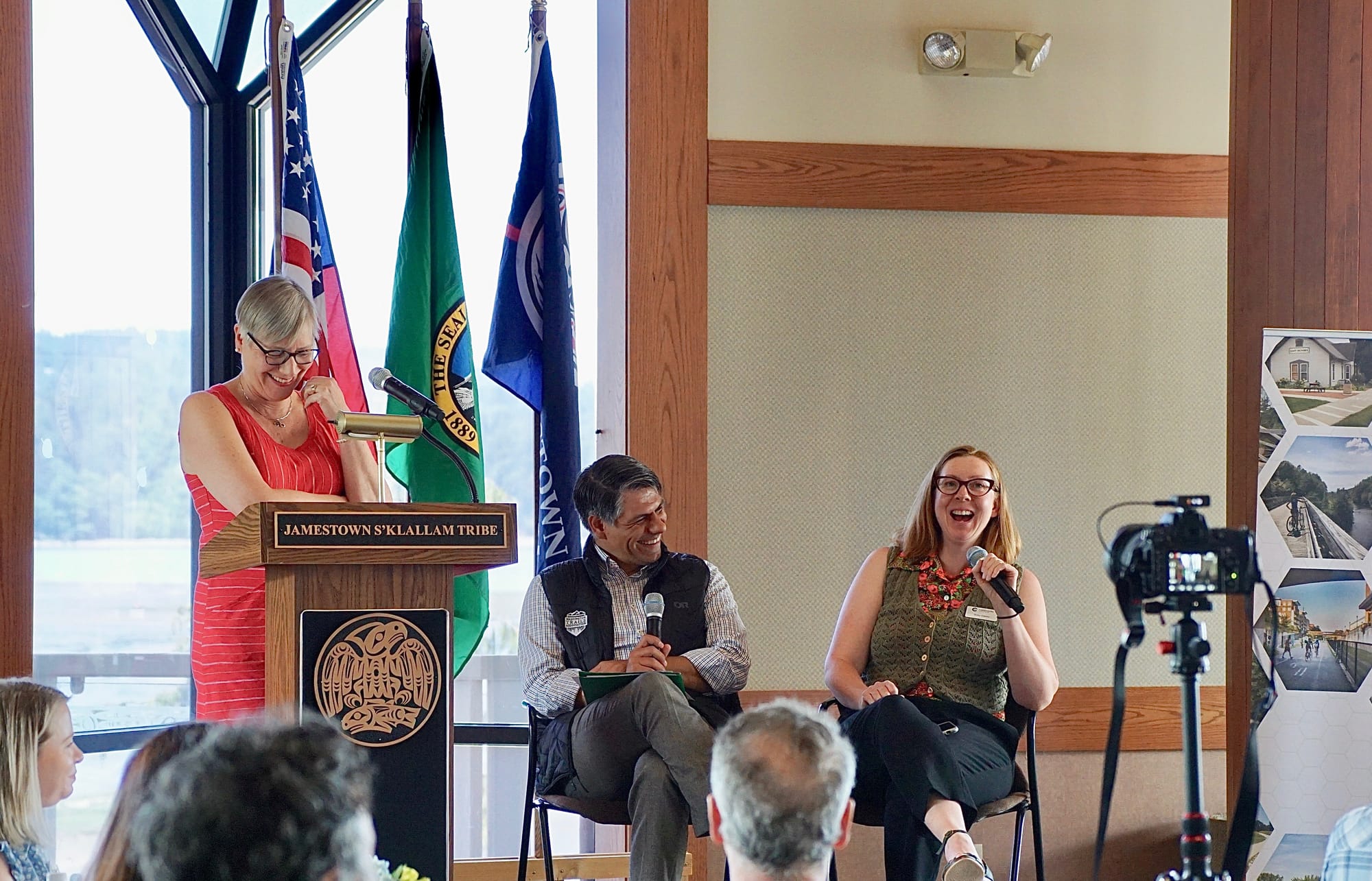 A Jamestown S’Klallam welcome was given by Theresa Lehman, Tribal Council Treasurer. Attending the receptions hosted by RTC at the Jamestown S”Klallam Tribe’s 7 Cedars Hotel and Red Cedar Hall at the Tribal Center were local trail advocates – the Peninsula Trails Coalition, the newly formed Puget Sound to Pacific Collaborative, Bainbridge Island Parks & Trails Foundation, the Washington Backcountry Horsemen, Sequim Wheelmen’s Adaptive Bike Program, Ian McKay (Ian’s Ride), Cascade Bicycle Club, Washington Trails Association – Washington Representative Steve Tharinger, Clallam and Jefferson County councilmembers, tribal representatives, and many others.