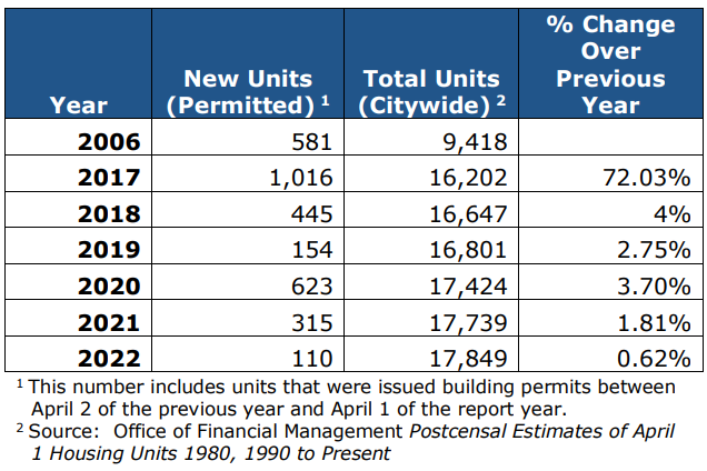 Marts argued it was premature to recalibrate Central Issaquah’s inclusionary program pointing to the disruption of the pandemic. However, that was misleading, since development activity has accelerated in some Puget Sound cities since the pandemic rather than slowing down. Seattle set a recent record in 2020 with more than 20,000 housing starts, as builders sought to take advantage of a streamlined online design review approval system.