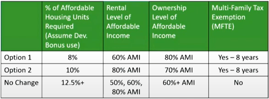 That’s where the “Pioneer Program” proposal that Issaquah City staff are crafting comes into play. The idea is to ratchet down the affordability requirements a tad in hopes of enticing a few mixed-use projects in Central Issaquah. The proposal also called for a eight-year Multi-Family Tax Exemption (MFTE) to provide another incentive to build. Since inclusionary zoning requirement would tick down only a couple points to 10% at 80% of area median income, it’s a modest proposal.