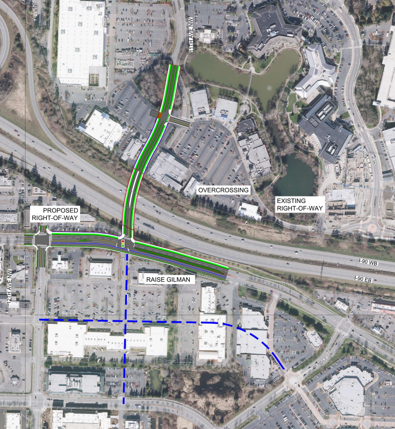 If the area is to transform into a transit-oriented neighborhood, more multimodal connectivity and walkable infrastructure needs to be on the way. Over the past few months, a consultant has been analyzing several different options for bridging I-90 in the general vicinity of an expected light rail station. This week, the council’s mobility and infrastructure committee got a full look at the recommended option picked by Mayor Mary Lou Pauly’s administration: a connection bridging 11th Avenue NW across the highway, with NW Gilman Drive raised up to make the needed change in elevation work.