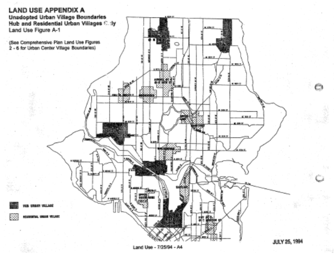 The drafters also didn’t fully trust the neighborhood planning process, stating: “… if at the end of the neighborhood planning cycle, a village boundary has not been established for a hub or residential urban village, the boundary shown in Land Use Appendix A of this plan shall become the boundary for that urban village” (page 10). On the whole, the framers of the 1994 plan got their way, with the urban villages created out of the neighborhood planning process resembling those proposed in 1994, with few exceptions.