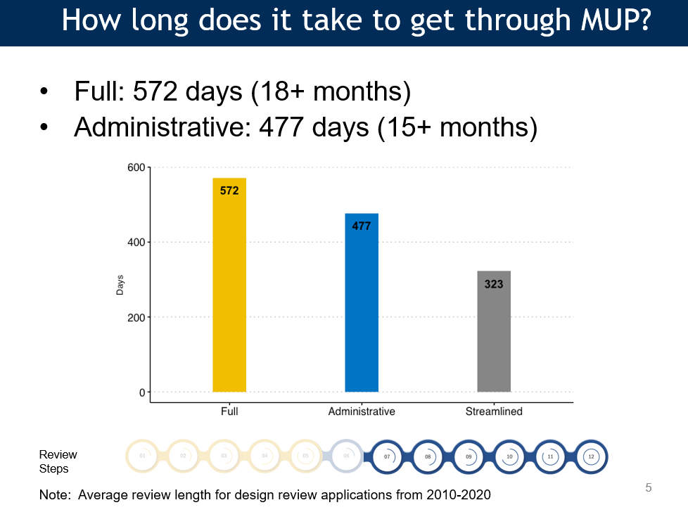ECONorthwest found that design review is taking more and more time to complete. From 2010 to 2020, the average time to get a MUP exceeded 18 months for full design review. A developer still has to get a building permit after getting the MUP, so this doesn’t encompass the entire permitting time.