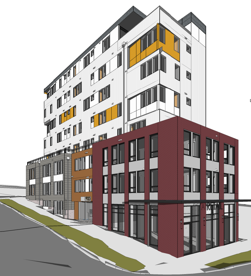 - An eight-story, 40-unit mixed-use proposal with over 1,000 square feet of commercial space and no parking.