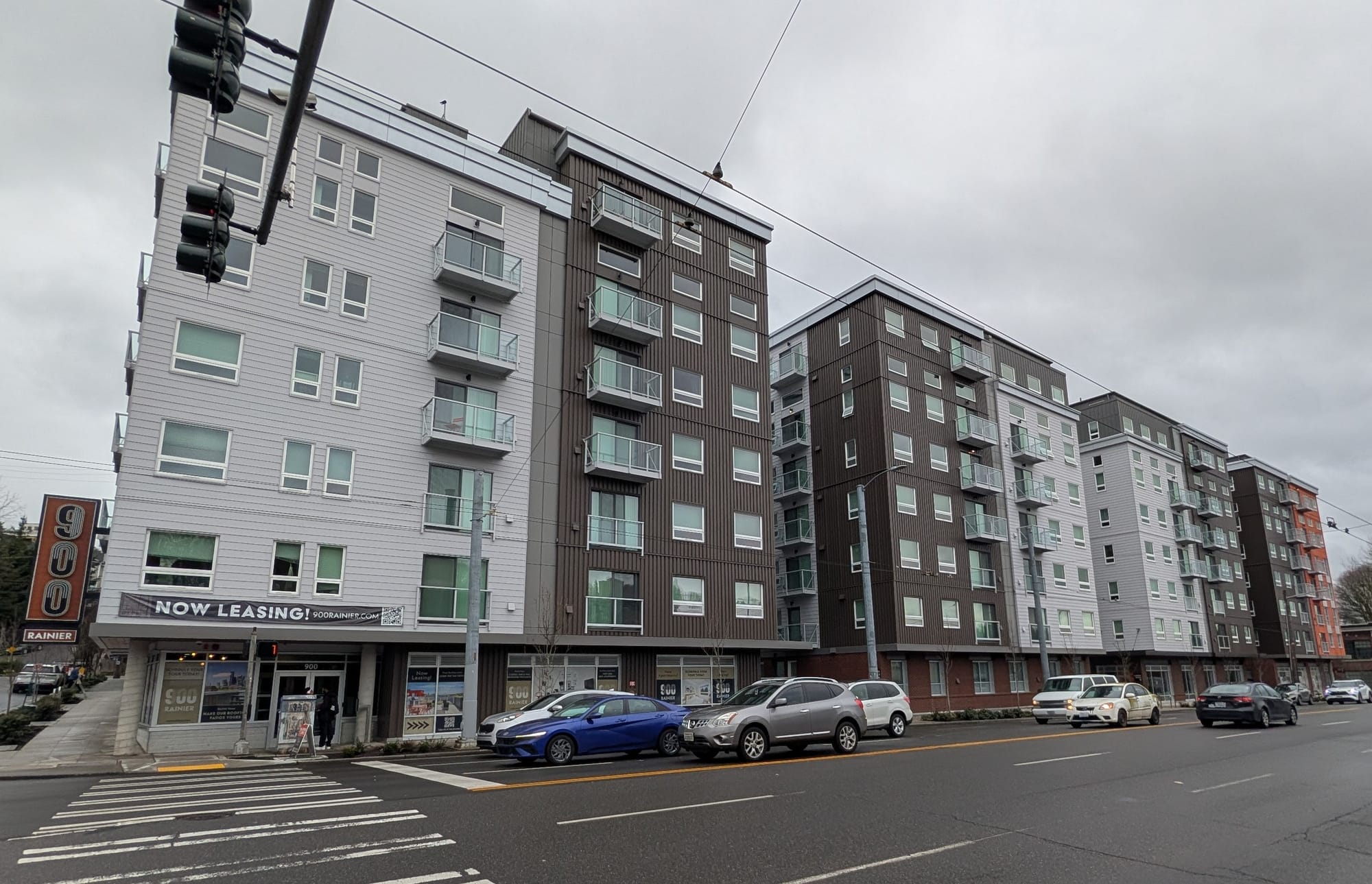 In that area bordered by I-90, Little Saigon, and newer townhomes, the latest and largest completion in the station area can be found in 900 Rainier. In 2025, the eight-story, 396-unit mixed-use building was completed with 2,032 square feet of commercial space, and 130 parking stalls. 110 of the building’s units are income-restricted.