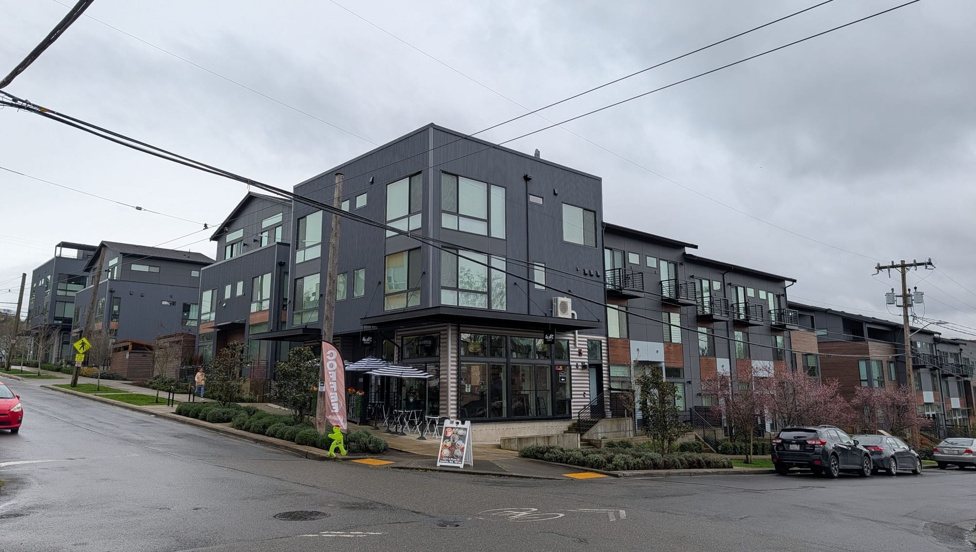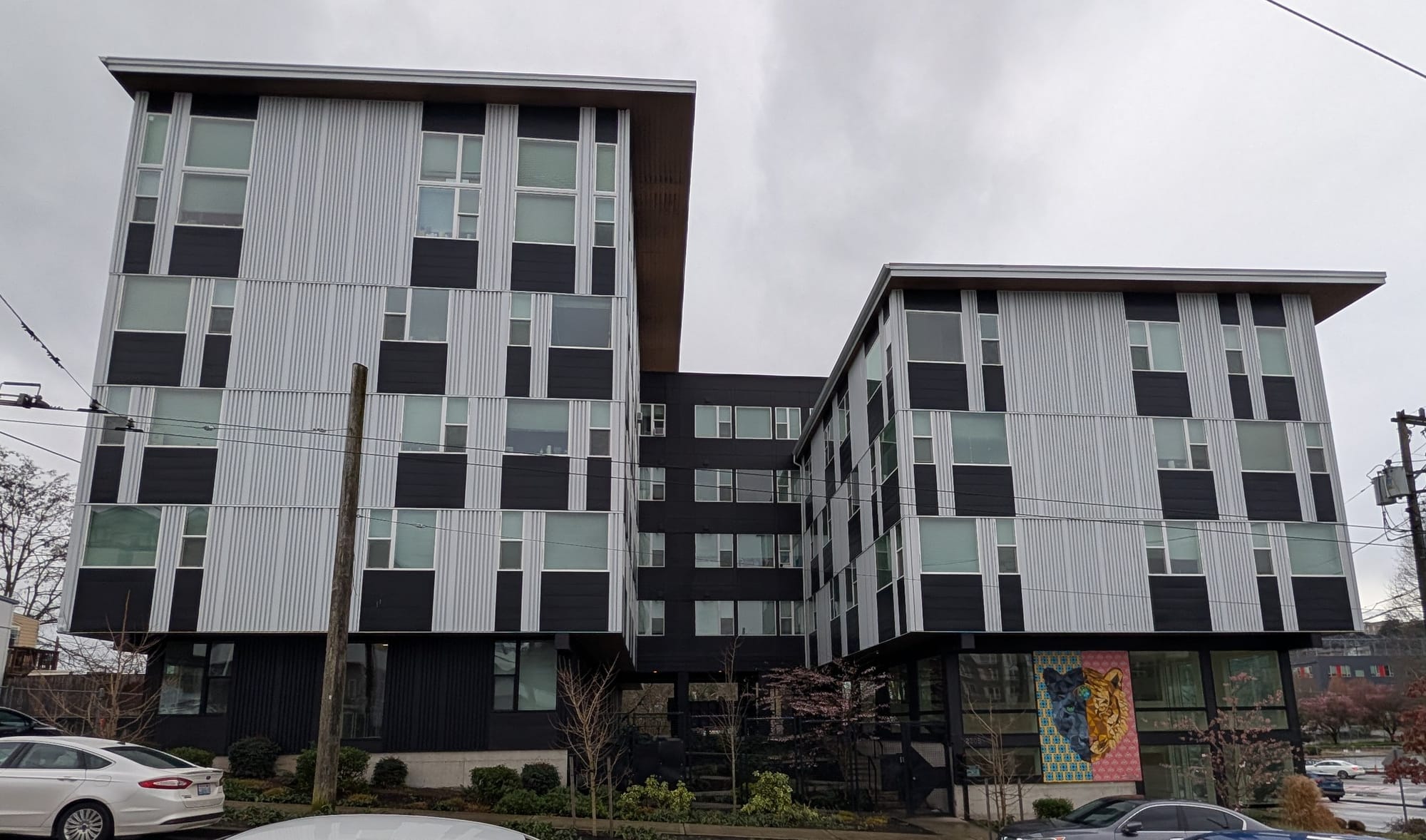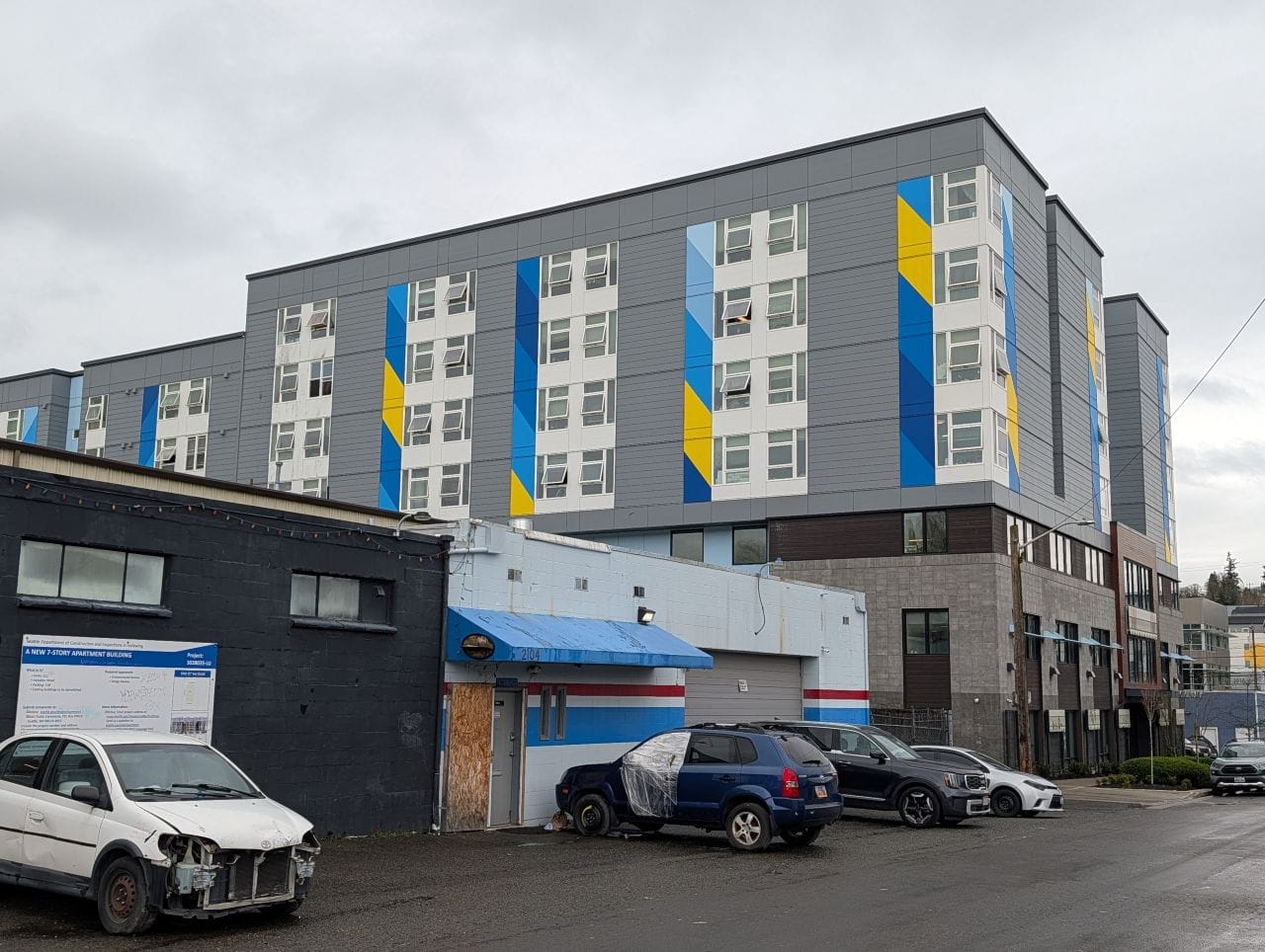 Next door, The Roost is a 33-unit, three-story co-living building with zero parking. It was completed in 2018.