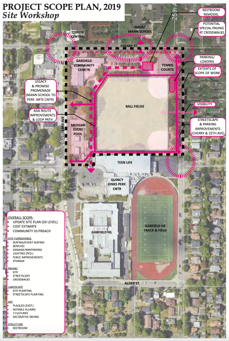 If you visit Garfield High School in Seattle’s Central District today, nearby you’ll see a large playfield flanked by a walking path that extends out to Cherry Street where it terminates in a plaza between a community center, parking lot, and playground. There’s a small community garden and voting drop box as well. Overall, it’s a remarkable spot because of the density of public services and amenities it offers. Other nearby amenities include an indoor public swimming pool, teen center, and auditorium, all located in a compact campus area. But the park itself doesn’t attract attention and the walking path simply exists as a means to get from one destination to another.