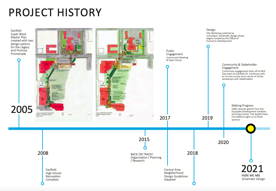 To understand why the Garfield Super Block represents such a big win for the neighborhood, it’s important to understand its backstory. The idea first emerged in 2004 after the City of Seattle and Seattle Public Schools used an ordinance variance to build a parking lot for the Quincy Jones Auditorium on public land. In exchange, the walking path and plaza near the community center in Garfield Park were supposed to be transformed into a vibrant public space, the heart of which would showcase “a legacy and promise promenade” presenting artwork from the seven ethnic groups, Duwamish, Jewish, Black, Filipino, Chinese, Japanese, and Italian, who inhabited the Central District neighborhood during different periods of its history.