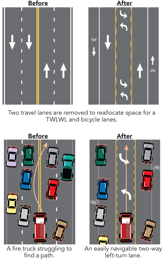 The finding that road diets do not generally impact emergency responses is not new. The FHWA has made it clear to cities that 4-to-3 road diets do not negatively impact emergency responses, including the claim on a set of “road diet myths” in 2016. “Contrary to popular belief, Road Diets do not degrade response times for law enforcement or emergency responses,” the agency’s fact sheet noted. In fact, FHWA stated, 4-to-3 upgrades can actually improve response times by providing that dedicated turn lane that can be used by emergency vehicles.