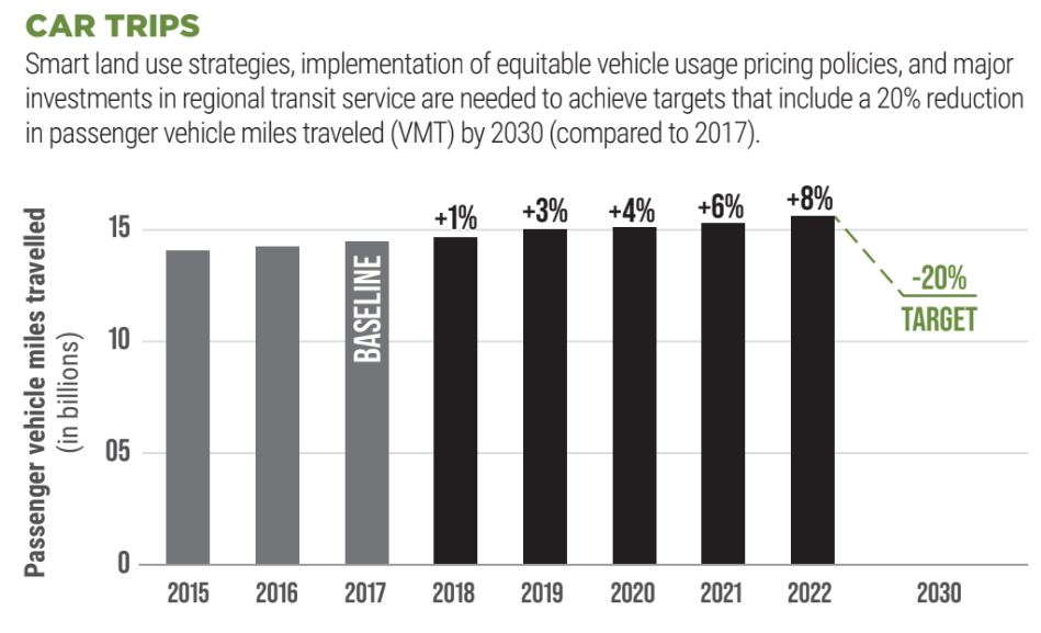 According to the report, in 2022 King County saw a net 2% increase year-over-year in the amount of total travel in passenger vehicles and light duty trucks, to 15.6 billion miles — over 6,700 miles for every single King County resident. The goal laid out in the plan is a 20% reduction from 2017 levels by 2030 and so far that number has increased over 2017 levels by 8%. Things are flat-out heading in the wrong direction.