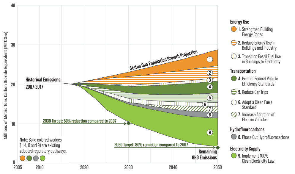 The SCAP calls for a 25% reduction in countywide emissions by 2025, a 50% reduction by 2030, and a 80% reduction by 2050, all compared to a 2007 baseline. Around one-third of the expected gains in emission reductions by 2030 are expected to come from improved transportation outcomes: shifting trips out of single-occupancy vehicles and into other modes.