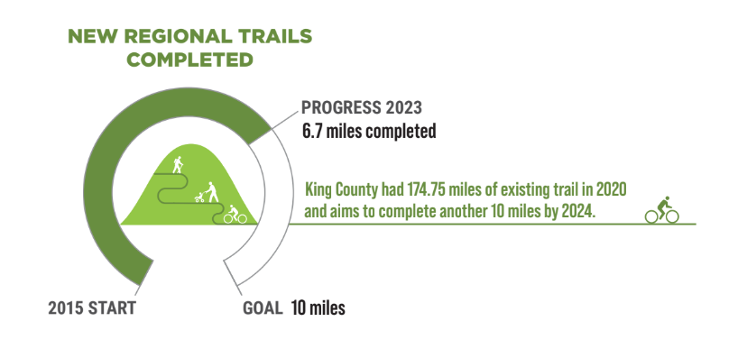 When it comes to the county’s role in promoting walking and biking, the SCAP’s goals are primary focused on regional trails, and include a very modest target of completing 10 miles of multi-use trails in a decade. The 6.7 miles completed so far includes the stretch of the East Lake Sammamish Trail that opened last year after a 20-year battle with property owners. The 10-mile goal is ultimately completely disconnected from the work of local jurisdictions who are in charge of connecting to the regional trail network, and illustrates the compartmentalization that will absolutely prove a barrier when it comes to making progress across levels of government to achieve needed work on climate.