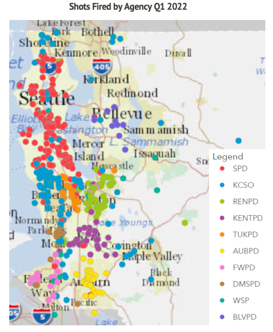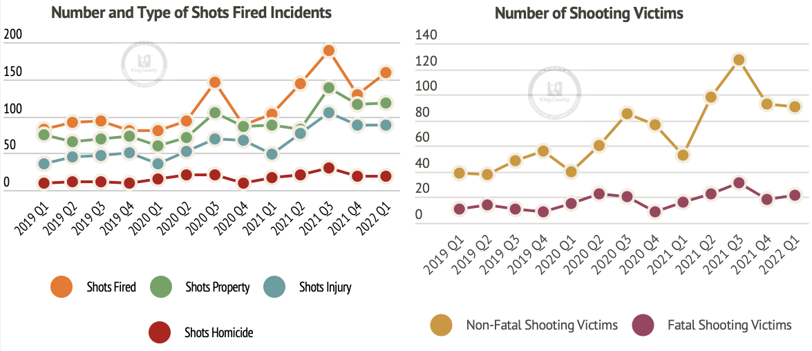 The preliminary tally of the first quarter of 2022 shows 22 people were killed and 91 people were injured in King County, while 384 shots were estimated to have been fired. While these numbers have not reached the heights of the third quarter of 2021, they are still above the average for the past five quarters of data. These shootings do not include suicides, confirmed self-inflicted shootings, or officer involved shootings.