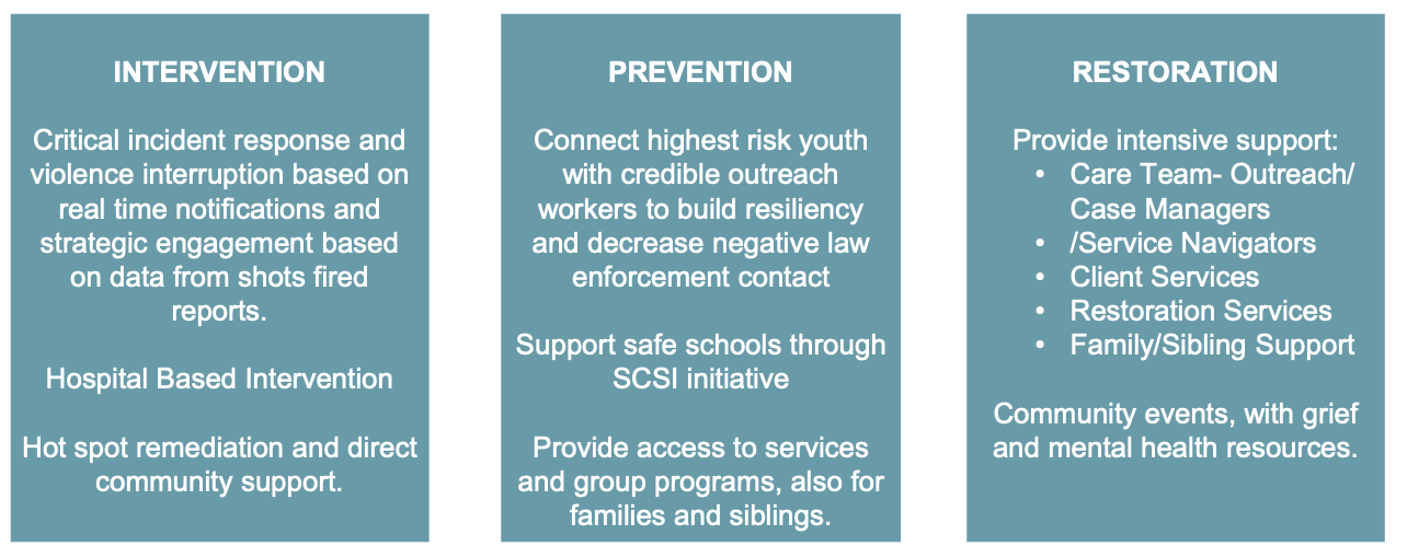 In terms of intervention, hospital-based interventions, or meeting with shooting victims while still in the emergency room, appears to be proving effective. While Lisch acknowledged that they had not gathered the hard data yet on the success of hospital-based interventions, she estimates that 75% of victims who are met bedside end up engaging with services — a percentage that drops steeply when the services are offered at a later date.