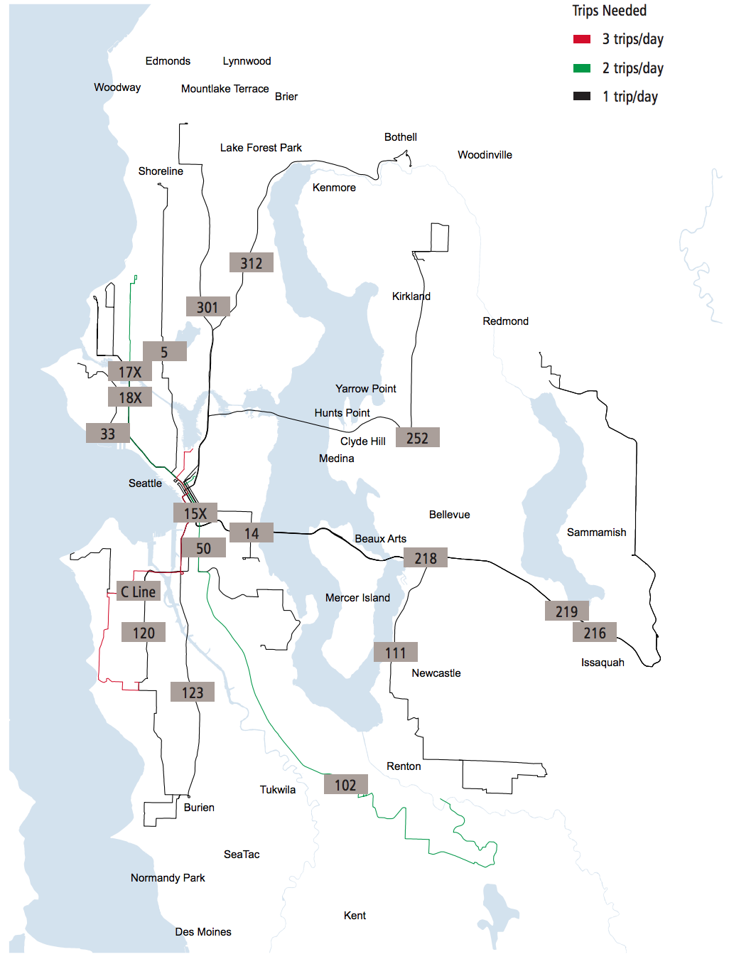 Finally, demand for extra night service is primarily focused on North Seattle routes, though several routes in South King County and the Eastside could use additional service, according the Service Guidelines.