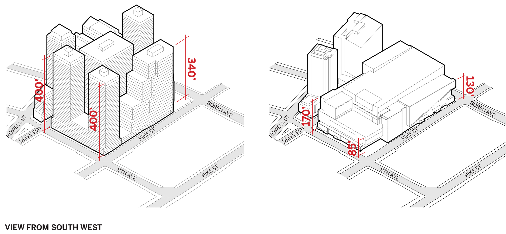 If the WSCC expansion were not happening, images from the project’s recent public benefits proposal show that the station property (along with co-development sites on two blocks across Olive Way) could have been a mix of office, residential, and hotel towers that is common in this part of Downtown.