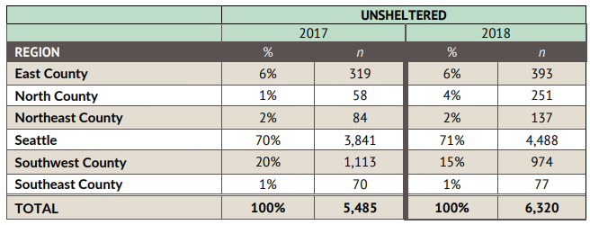 The data shows that Seattle continues to be the center of the crisis, but the southwest portion of King County has a large unsheltered population, too. 71% of the county’s unsheltered population resided in Seattle.