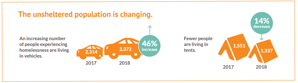 The composition of the unsheltered population also changed. 1,058 more people are living in vehicles, a 46% increase. People living in tents, meanwhile, decreased by 214 individuals.