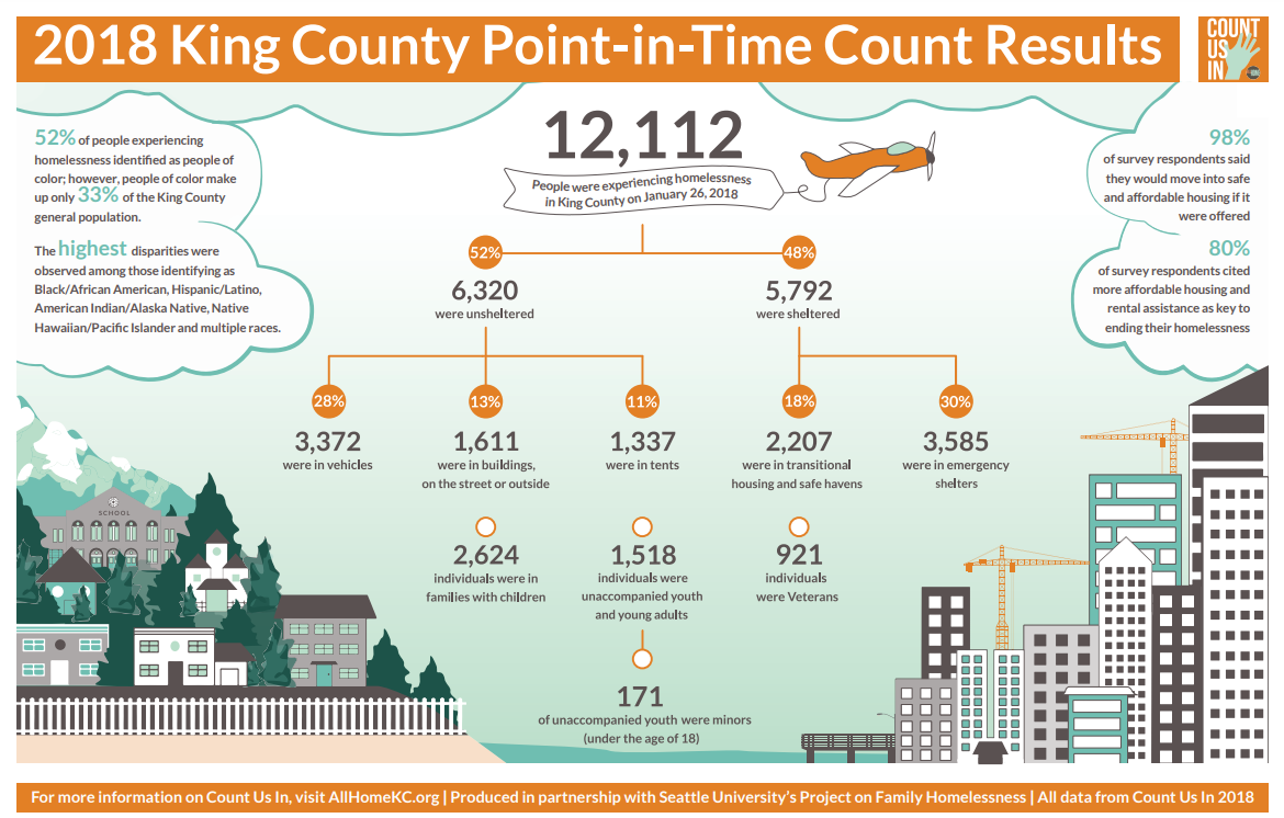 Seattle continues to see steep rent increases, and the lack of affordable housing seems to be driving the crisis. 98% of Count Us In Survey respondents said they would move into safe and affordable housing if it were offered, All Home’s report said. Regional leaders are seeking to increase affordable housing supply, although perhaps not with the decisiveness that advocates would hope. Earlier this month, Mayor Jenny Durkan called for a regional partnership to tackle homelessness and the Seattle City Council passed an employee hours tax to fund affordable housing, nearly cutting in half after Amazon threatened to pull out of town and Mayor Durkan threatened a veto. Mayor Durkan held a press conference on Wednesday to announce investments in emergency shelter and rent vouchers.