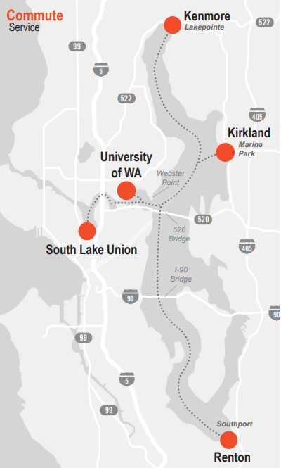 The Puget Sound Regional Council (PSRC) has analyzed seven passenger-only ferry routes and issued results this month. Two Lake Washington routes–Kirkland to the University of Washington (UW) and Kenmore to UW–rose to the top, showing significant time savings and ridership potential with relatively low operating cost expected. Commissioned by the Washington State Legislature in 2019, the report evaluates demand and costs for new Puget Sound passenger ferry routes. The Legislature authorized PSRC to lead the study due to the agency’s experience with a 2008 passenger-only ferry study, whose identified near-term routes will all be in operation by the end of 2020.