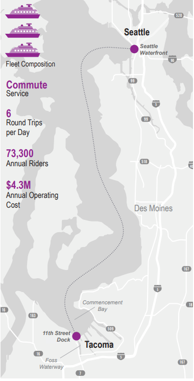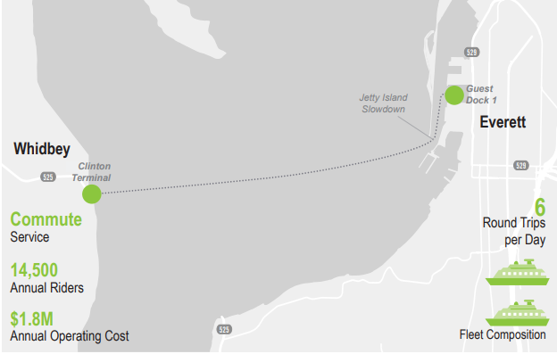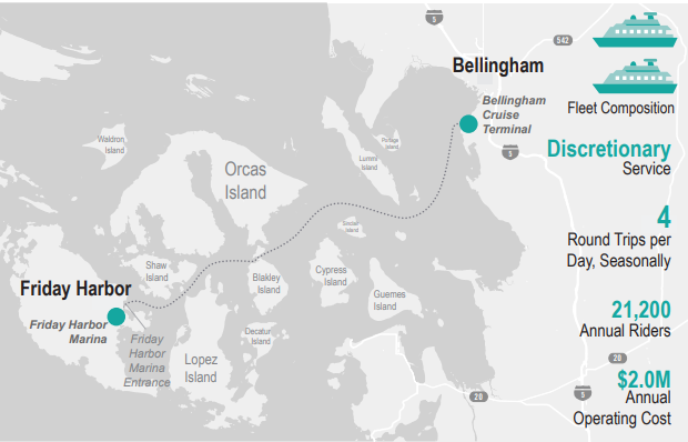 Mock route profiles are developed for all seven of the PSRC’s chosen routes to generate figures for cost and ridership, and detect hurdles and opportunities. Outside of Bellingham-Friday Harbor, which is framed as a seasonal recreational route operating seven days a week with four roundtrip a day, all the routes are given a hypothetical commute-focused, year-round, and five days a week in operation with six departures a day service.
