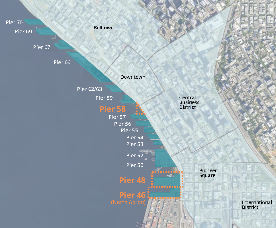 The agency’s preferred option is state-owned Pier 48 right next door, where King County holds a short-term lease on a maintenance float. But two additional options are set to be carried into a full environmental analysis: a portion of Pier 46 to the south, and newly rebuilt Pier 58 further north. Kitsap Transit is accepting comments to guide the scope of that environmental analysis through August 11, with the goal of completing its review by 2027.