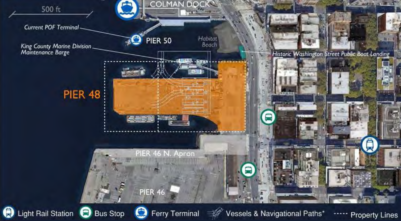 “A new terminal located at the Pier 46 North Apron is feasible but would require demolition of the existing Pier 48 and long-term use of in-water space on the Pier 48 property,” that report continued. Pier 46 is also being eyed for base expansion by the U.S. Coast Guard, a move that the Port of Seattle has pushed back on, arguing that base expansion would give up valuable cargo loading space.