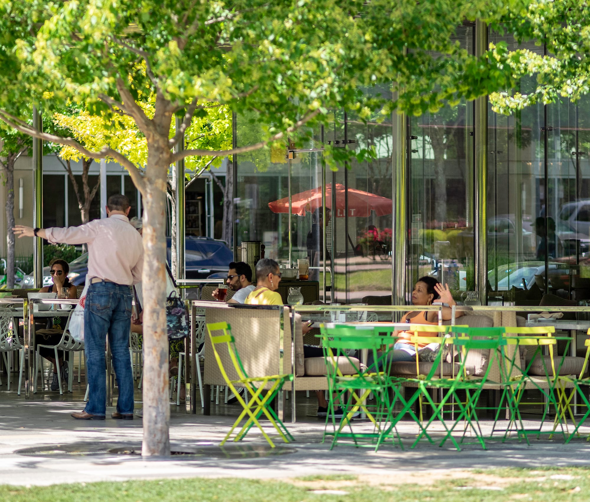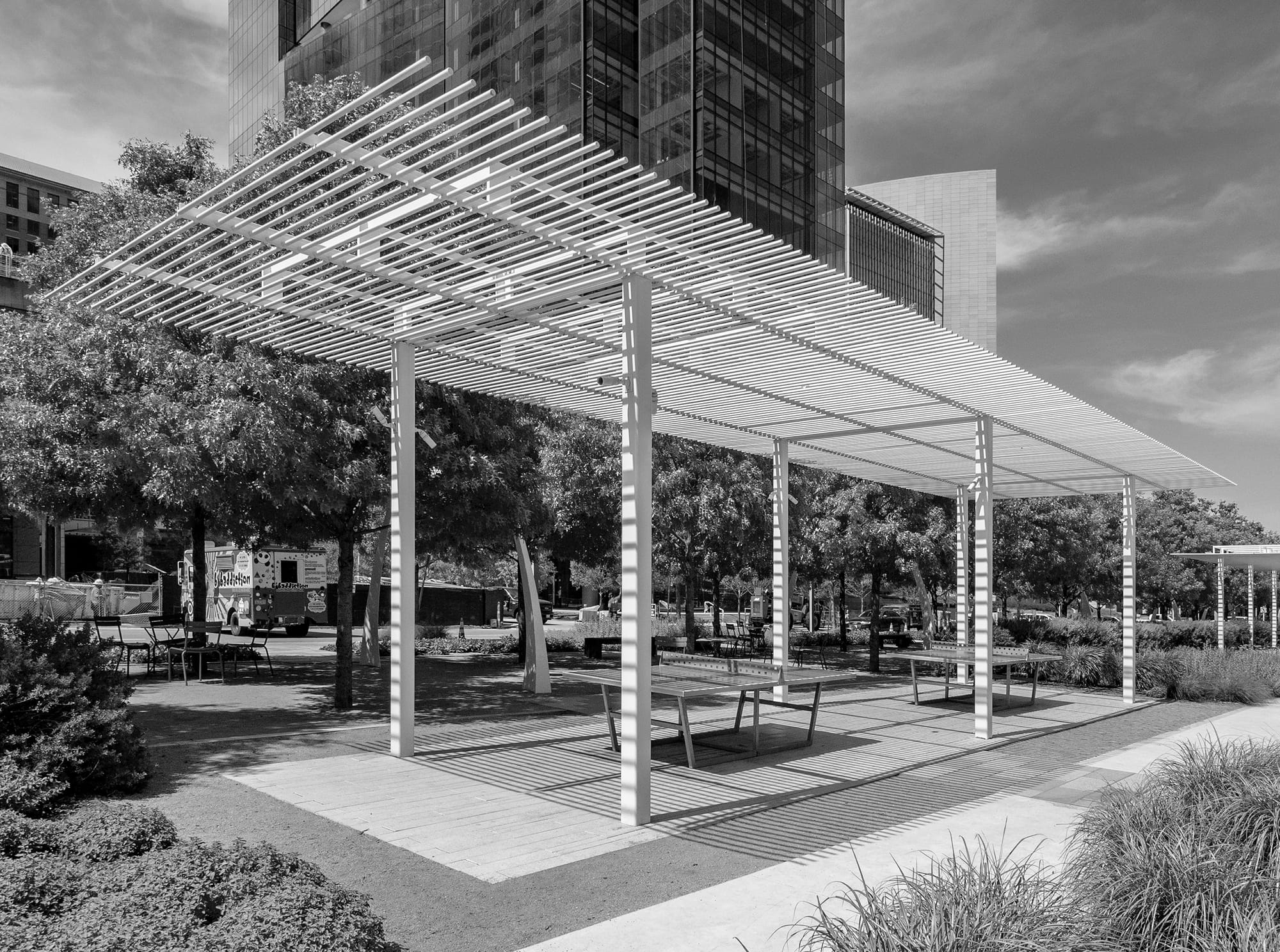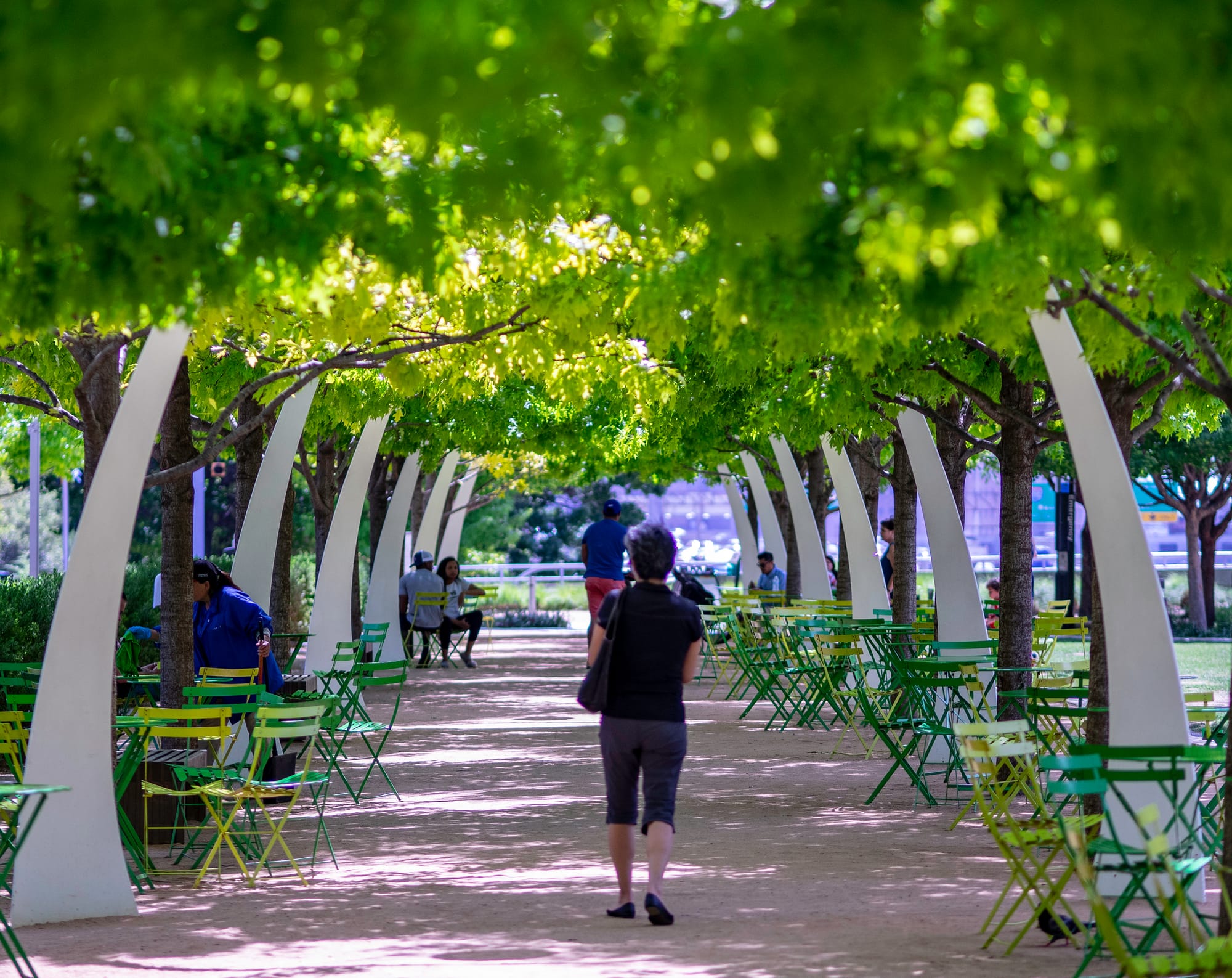One neither needs to play table tennis, wade in the waters, nor play a pick-up game of soccer in the Great Lawn to enjoy the park. Should you wish to simply stroll, there is the aforementioned and very lovely allée of trees. Having had the good fortune to stroll among the great parks of the United States and Europe, this pathway leaves little to be desired. Its now mature trees, ample seating opportunities, and classic crushed gravel path are complemented by perfectly spaced, and by appearance, custom designed light poles whose gentle arcs not only enhance the space’s intimacy but also harken to the crescent pathway across the Great Lawn. For the more leisurely-minded, several carts with books, magazines, and newspapers, sponsored by the Dallas Morning News, are available at the edge of the lawn.