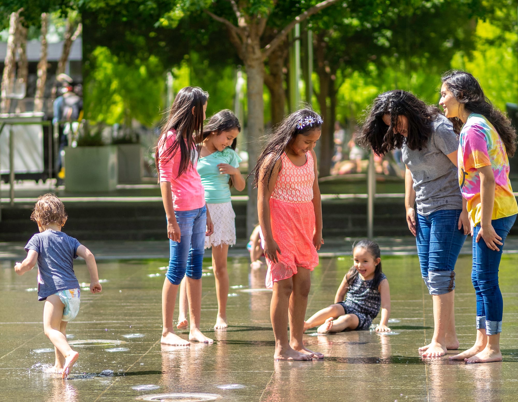 An important part of my advocacy for lidding Interstate 5 includes letting folks know about successful lid projects around the country. Lid I-5’s co-chair Scott Bonjukian often refers to Dallas’s Klyde Warren Park (KWP) as the gold standard of freeway lid parks. After a brief visit this past Monday, that lofty pronouncement may not be far from the truth. The park, a bit over five acres (making it about the same size as Seattle’s own Freeway Park, also a lid park), was completed in 2012 over State Highway Spur 366. Nearly half of KWP’s construction cost was paid for through private donations, with the remainder funded through various government grants at the local, state, and federal levels. There is a ‘friends of’ organization which supports the park and manages its programming. Details can be found here. The lead designer was OJB Landscape Architects. Even though the visit was around 3:00pm on a Tuesday afternoon, and the lunch crowd had since disappeared, the park was well used by a mix of families, couples, and individuals all enjoying the park’s mix of both active and passive uses.