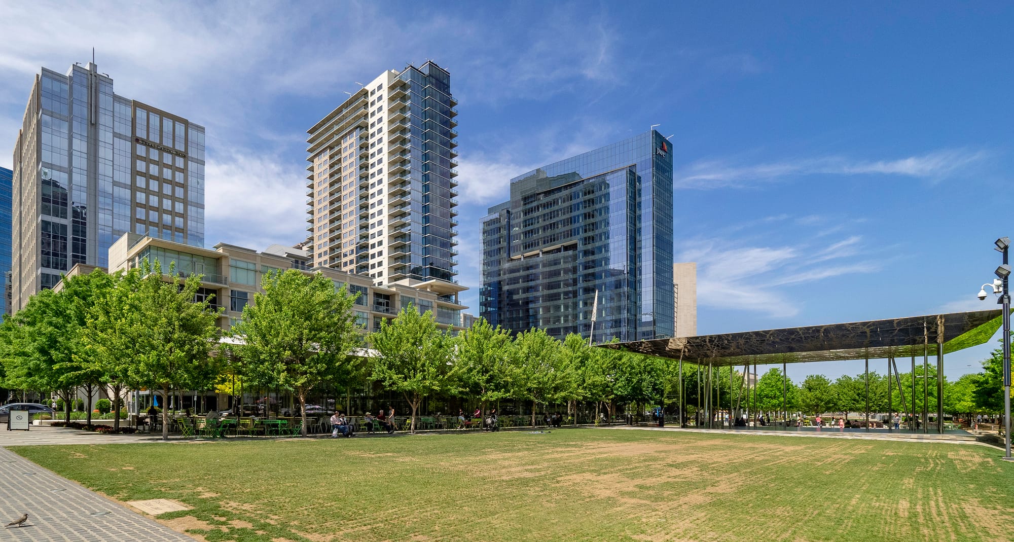 KWP is a linear park following Dallas’s street grid. It is one block wide and three blocks long. One street was closed in its western section, while on its eastern section the street remains open to motor vehicles. The larger of the two sections, the western, contains the park’s large pavilion, water feature, restaurants, and playground. On entering its western gateway, it quickly becomes evident that this is a successful space. Its edges are well defined by both plantings and buildings yet they are sufficiently transparent and inviting to prompt anyone to enter. A large extent of the border includes a crushed stone path shaded by broadleaf trees, necessary for providing shade from the Dallas sun. Cafe tables dispersed along the path allow visitors to both seek relief from the heat and be silent sentinels for the expanse of turf that is the majority of the park’s interior, Great Lawn. Beyond the park’s edge, numerous shining glass towers remind visitors they are in the center city and add borrowed elegance.