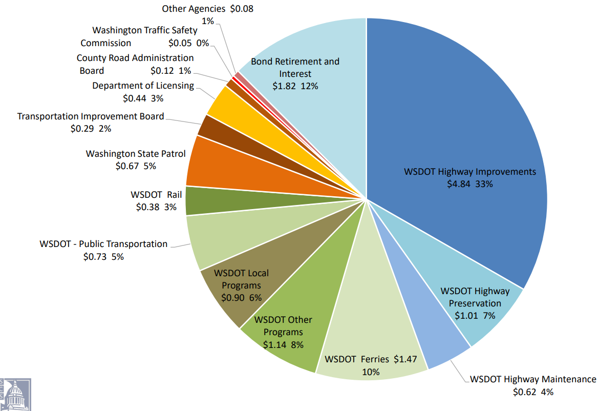 Highway “improvements” are the single biggest expenditure in Washington’s transportation budget, which is separate from the state’s operating and capital budgets, though some funding sources do overlap. The operating budget also faces a significant budget hole, but the transportation’s budget issues are much more systemic, with any real fixes likely to take years to implement. The biggest projects in the highway improvement budget, apart from court-ordered fish passage projects, are long-term highway megaprojects, like the North Spokane Corridor, the Puget Sound Gateway, and Interstate Bridge Replacement, which would widen I-5 in in Clark County.