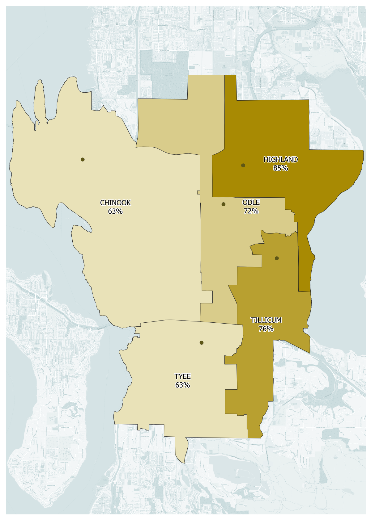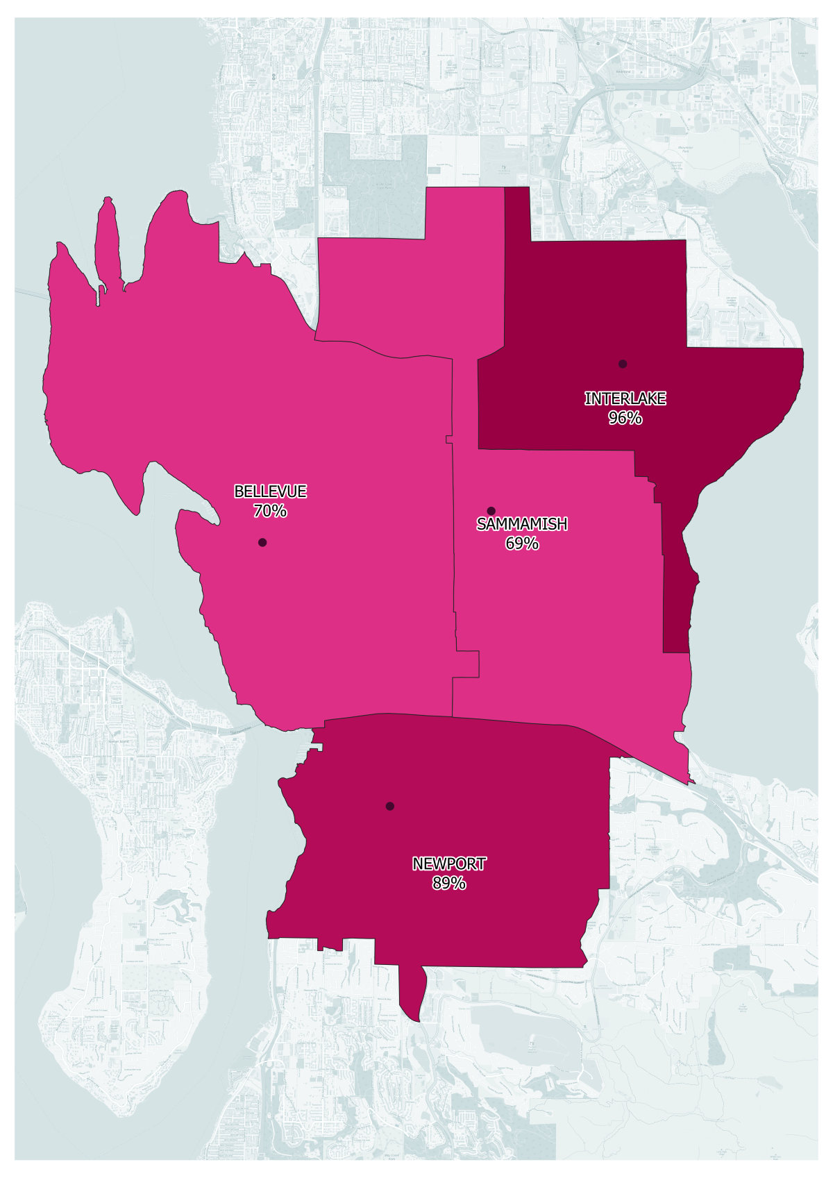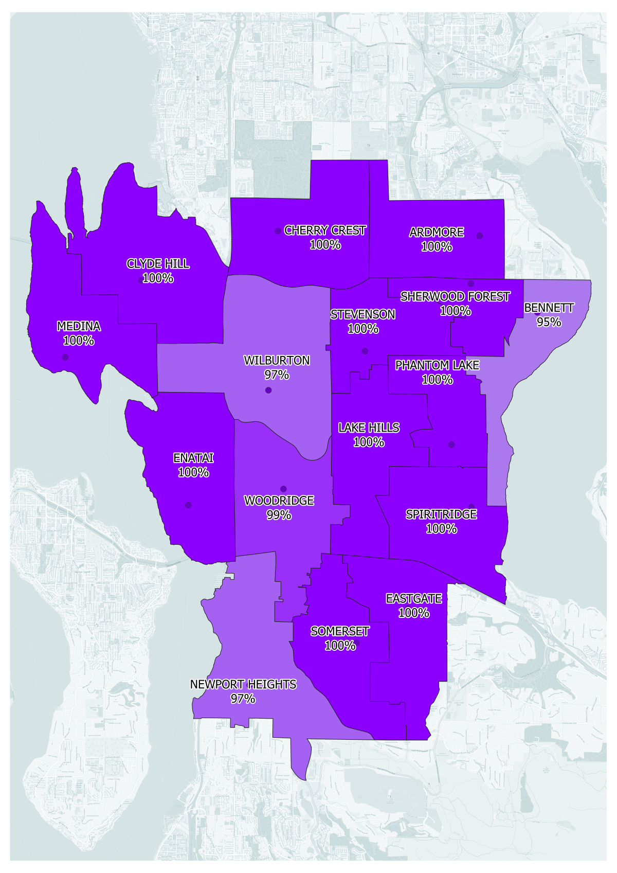 In addition to essential businesses, I also chose to examine Bellevue residents’ access to local schools, but I was required to change my approach. Because which public school one attends is assigned based on address, I instead chose to calculate bikeable areas from the schools themselves (rather than the city’s neighborhoods) and determine what percentage of the school’s attendance area fell within that polygon. It’s important to note that Bellevue School District does not encompass all of the city, and some parts of the district fall outside of Bellevue’s borders. However, the district does serve students from all of Bellevue’s 16 neighborhoods–students’ ease of access to their schools should therefore be a principal concern for Bellevue’s transportation staff.