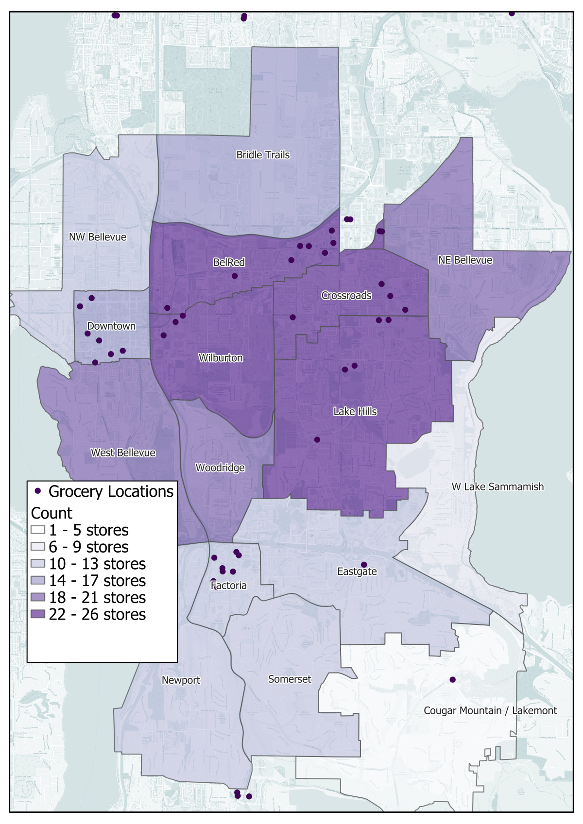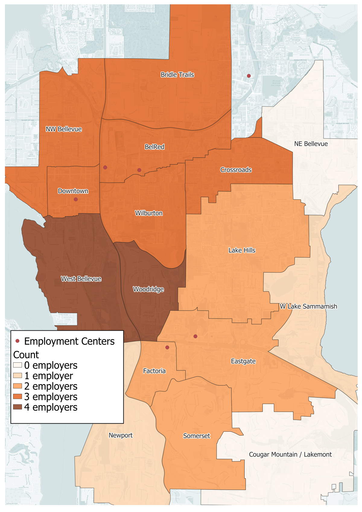 Such gridded networks enable more direct and efficient travel because of their straight lines, which stand in contrast to the windier, more indirect streets common in the subdivisions of NE Bellevue, W Lake Sammamish, and Somerset. Neighborhoods like Newport Hills are further limited by geography; its border with Lake Washington means its catchment area can only extend in three cardinal directions. However, bikeable area size alone is not enough to determine access–it’s important to investigate how many businesses, services, and points of interest fall within these areas to see how neighborhoods stand.