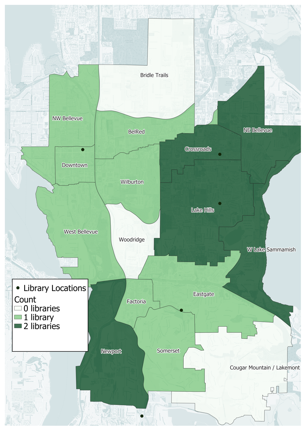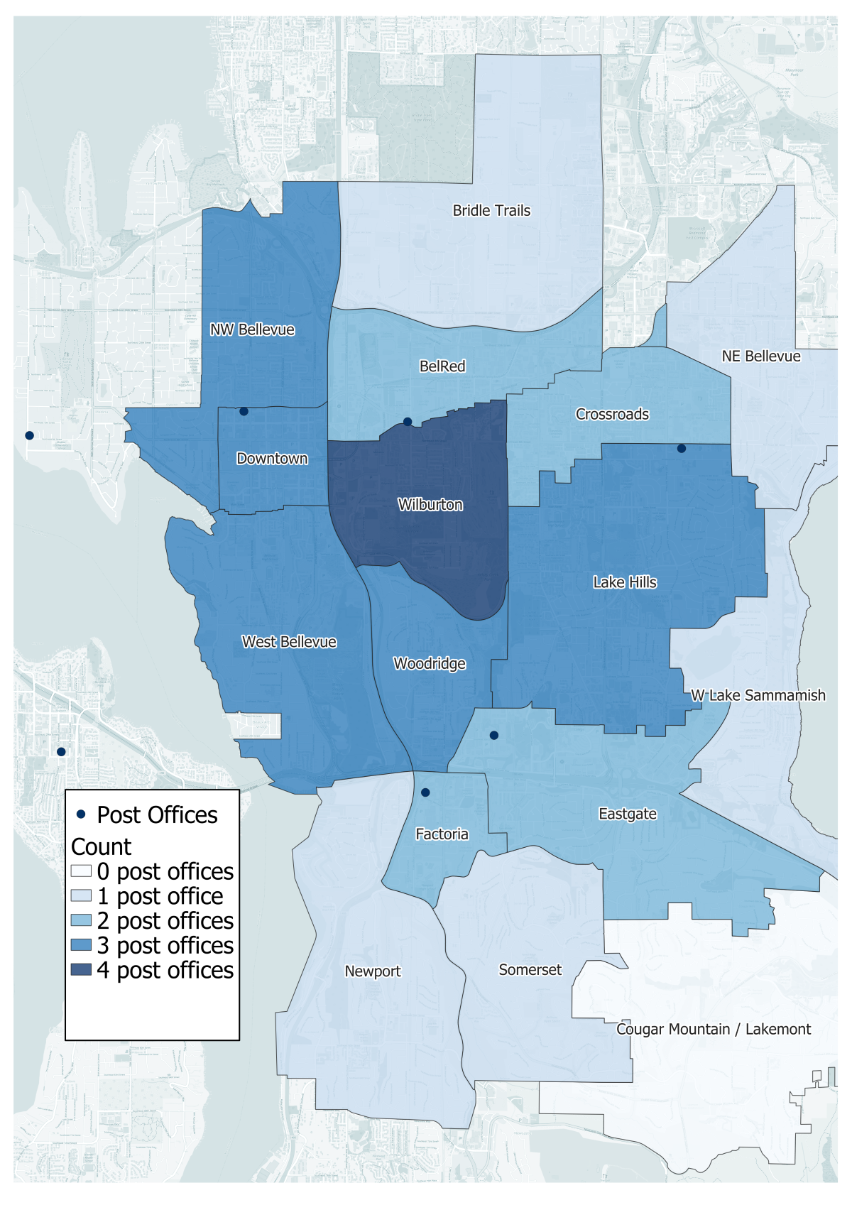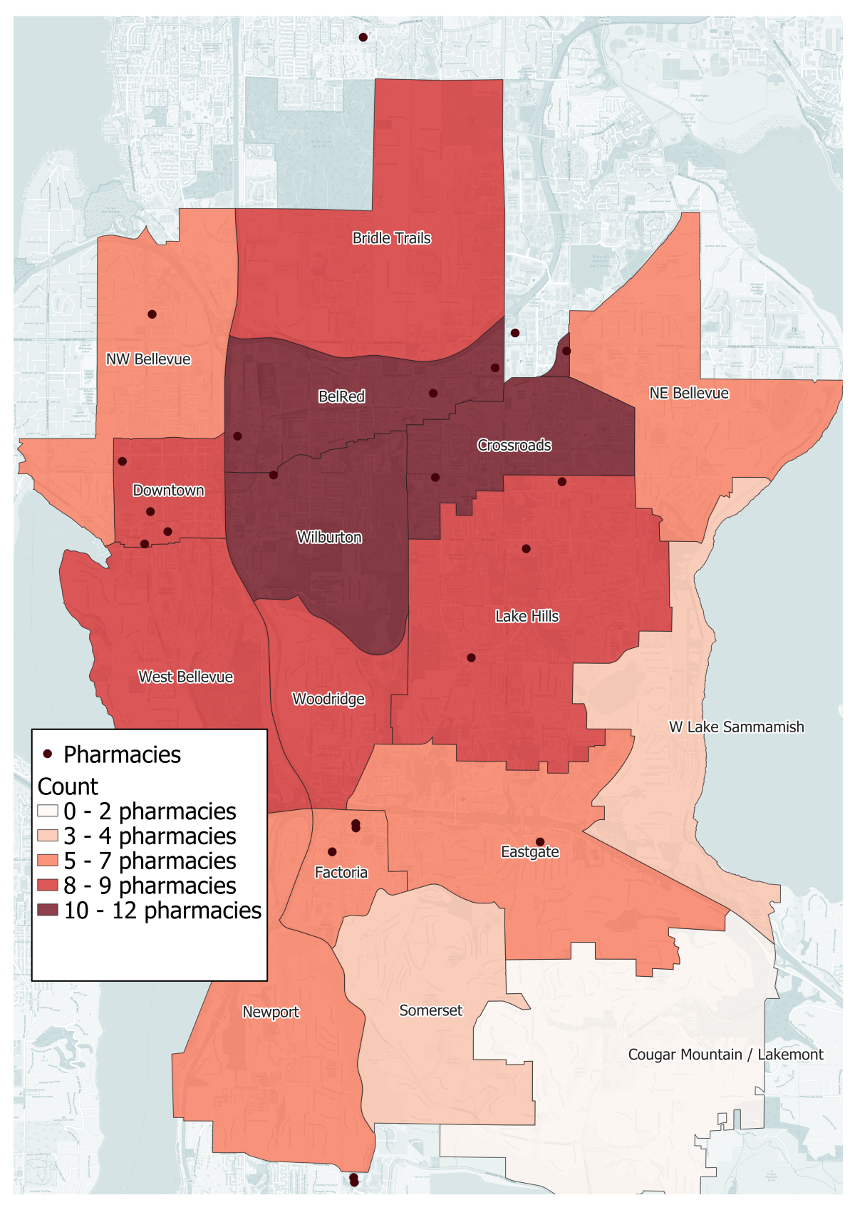 Nearly all neighborhoods had access to at least one business of each type examined (grocery store, library, pharmacy, post office, and major employment centers) within a 15-minute bike ride. Neighborhoods between SR-520 and I-90 consistently had the best access to the destinations examined, while communities on the periphery had more limited access (or none at all). Of particular note is Cougar Mountain/Lakemont, which had no employment centers, libraries, pharmacies, and post offices within a 15-minute bike ride (and only one grocery store). Contrasted with a neighborhood like Wilburton, with its access to three employment centers, a library, twelve pharmacies, four post offices, and 26 grocery stores, it’s evident that there is a disparity in destination access between Bellevue neighborhoods. However, it’s important to note that every neighborhood, except Cougar Mountain/Lakemont and Bridle Trails, has access to at least one location of each destination type, with many neighborhoods having access to multiple.