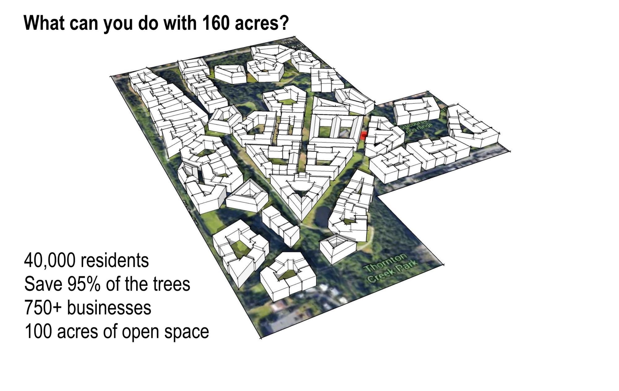 The neighborhood would create housing in our city rather than pushing people into sprawl. For 35,000 to live in this neighborhood we only need 60 acres, and it would be designed around the freedom of transit and walkability. To house them in suburban sprawl, it would take 3,000 acres and they’d be limited to car dependency. Those 35,000 people are moving to the region either way, do we want them to live in Seattle or the suburban fringe encroaching on wilderness?