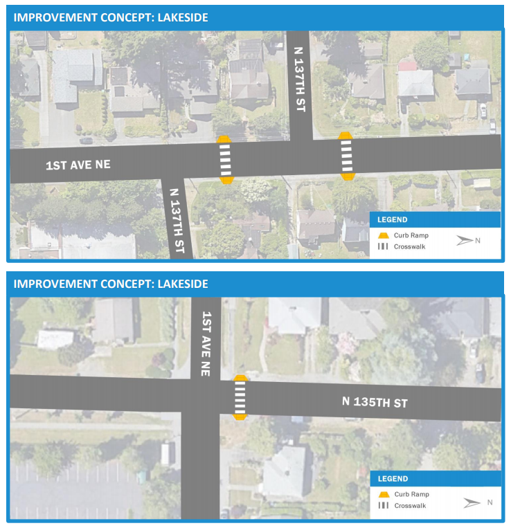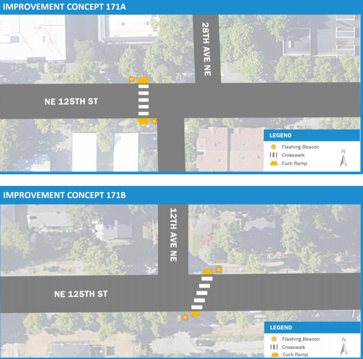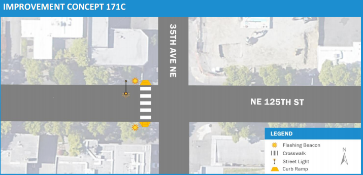 This project will spend $400,000 to create three additional crosswalks across NE 125th St at 35th Ave NE, 28th Ave NE, and 12th Ave NE, and add flashing beacons there.