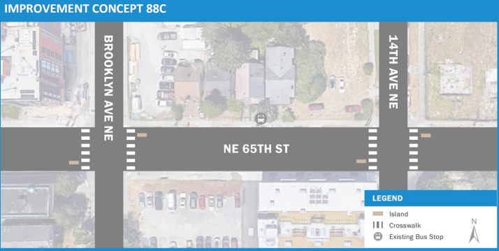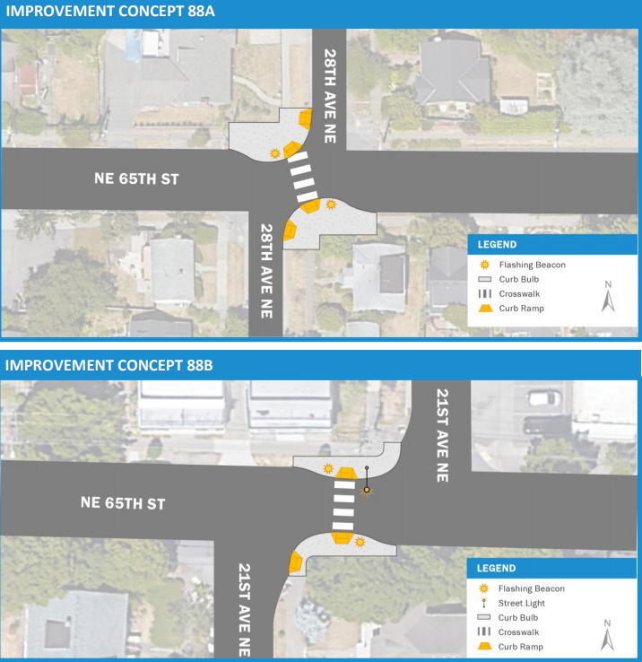 NE 65th St just received a Vision Zero corridor treatment but at the time, additional marked crosswalks were ruled out (counterintuitively) by low pedestrian crossing volumes. This project would spend $850,000 to add marked crosswalks at Brooklyn Ave NE, 14th, 21st, and 28th Avenues, as well as flashing beacons at the latter two intersections.