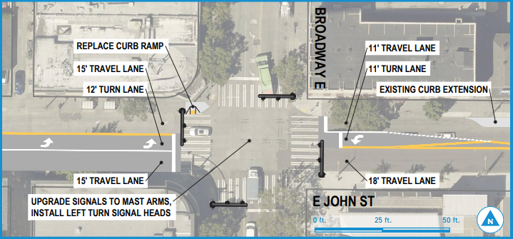 Broadway and Olive Way/John Street, directly in front of Capitol Hill Station, will get left turn signals to protected crossing pedestrians from turning vehicles. SDOT had previously said they would fund this but announced a lack of funds last year would mean they only painted new lane lines. Broadway and John Street is one of the busiest intersections in the city for pedestrians: the project page lists 1,000 people on foot per hour during peak times. The project cost is $945,000.
