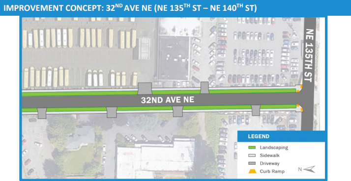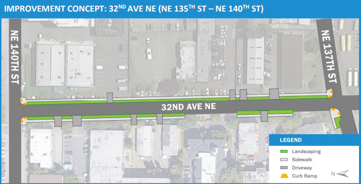 This would spend $1.1 million to construct new permanent concrete sidewalks on 32nd Ave NE between NE 135th St and NE 140th St with landscaping.