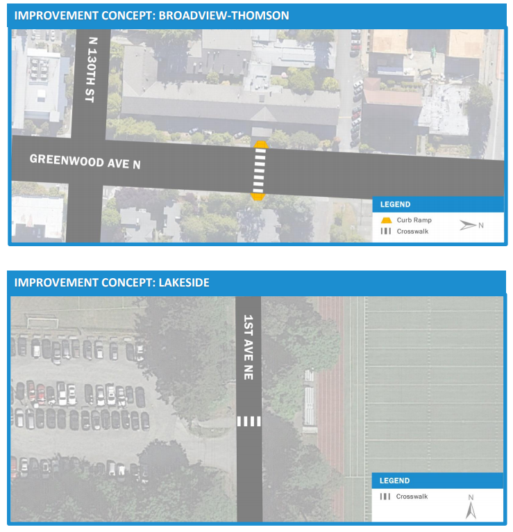 This project will add additional crosswalks near several schools in District 5: Lakeside, Ingraham, Broadview Thompson, and Northgate. In several locations there are already existing crosswalks that the project will make more striking and noticeable through the use of community crosswalk design. The project cost is $200,000.