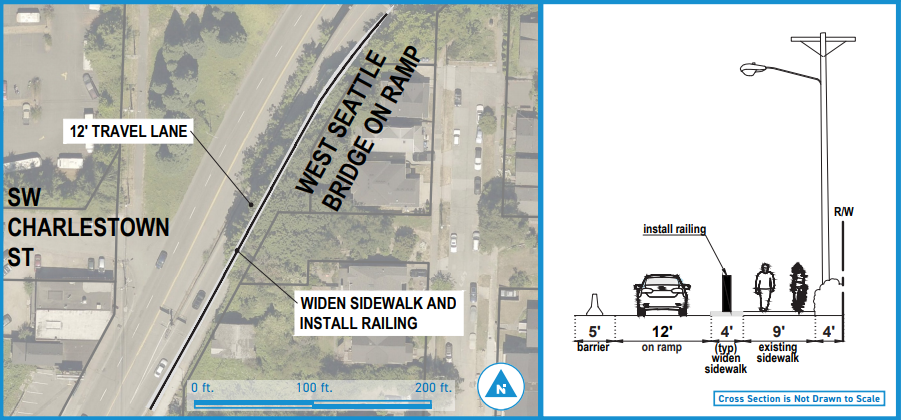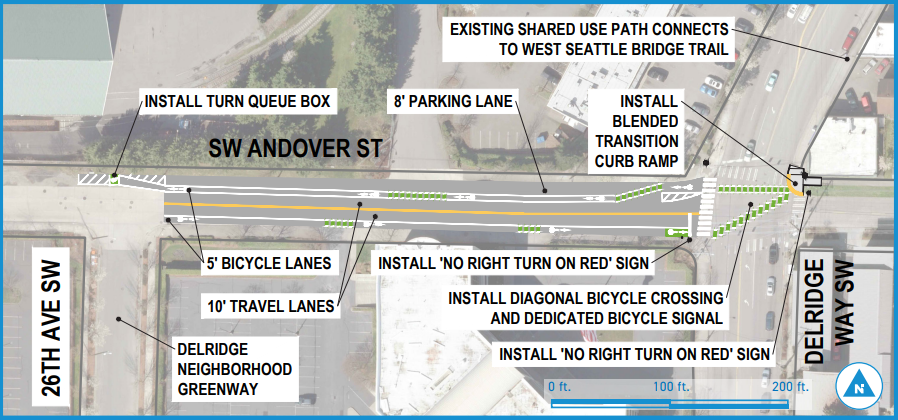 This project, on the other end of Delridge Way, would spend $387,000 to connect the heavily used West Seattle bridge trail to the 26th Ave SW greenway with two separate projects: a (door zone) bike lane on SW Andover St between 26th Ave SW and Delridge Way, with a diagonal bike crossing for users to cross to the shared use path (sidewalk) on Delridge Way, and a new railing alongside the street on a segment of that sidewalk so that riders feel more comfortable alongside the 30-mph street.