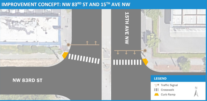 15th Ave NW has a cut-out median for people utilizing the unmarked crosswalk at NW 83rd St but compliance is low. This would spend $450,000 to add a pedestrian half-signal and a marked crosswalk on the north side of the intersection.