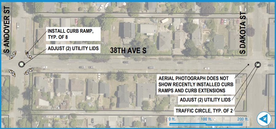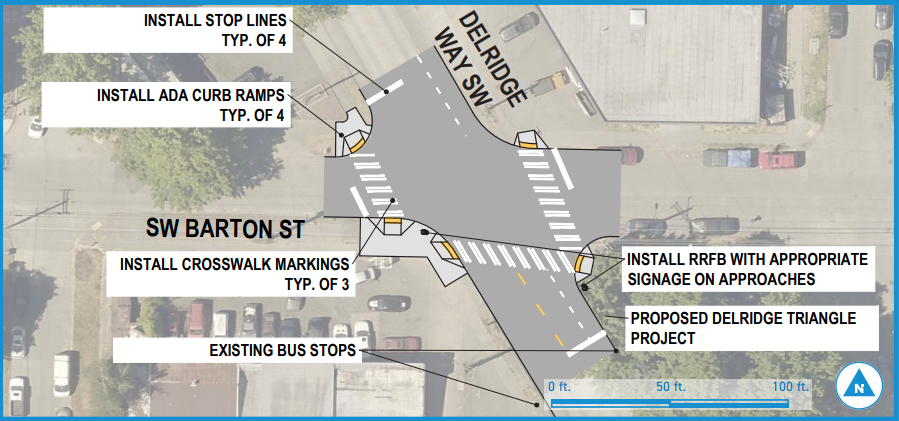 Delridge at Barton is currently an unsignaled, unmarked intersection that’s a fair distance from nearby marked crossings. The $160,000 project here would add marked crosswalks on three sides of the intersection, add a rapid flashing beacon to improve visibility, and install new curb ramps for accessibility.